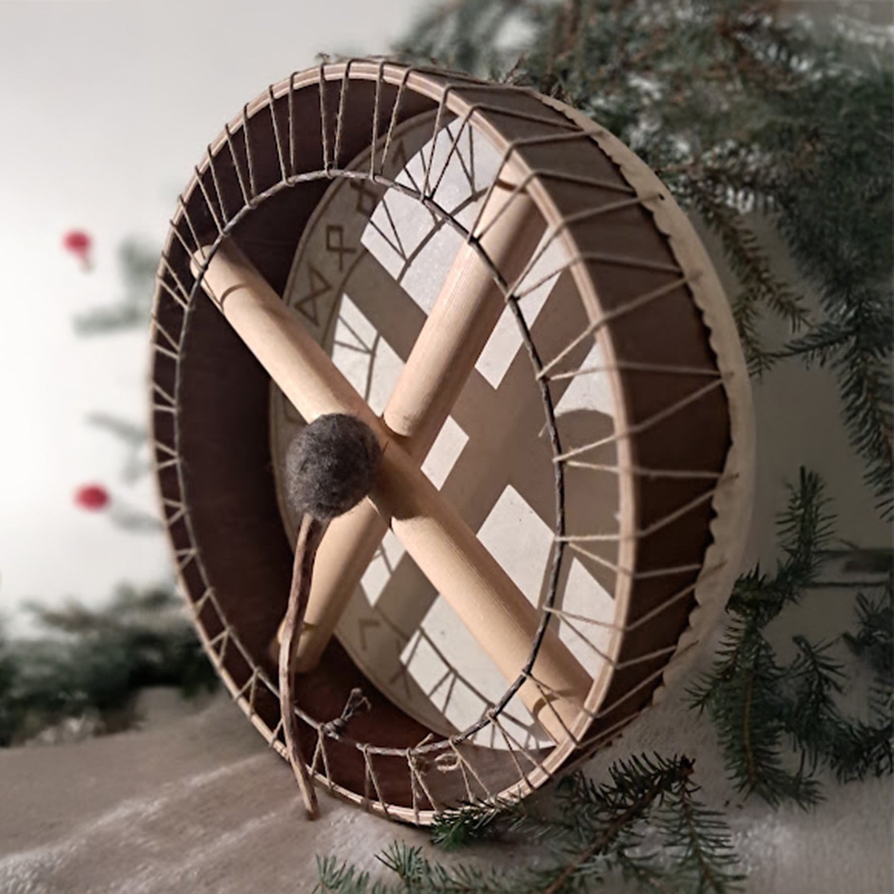 Traditionelle Schamanentrommel, die in sorgfältiger Handarbeit in Finnland hergestellt wird, wo alte nordische schamanische Traditionen über Jahrhunderte hinweg überlebt haben. Sie wurde aus traditionellen Materialien ohne den Einsatz von Werkzeugen hergestellt. Lediglich eine Handsäge, ein Messer und Schmirgelpapier wurden während des Prozesses verwendet. Diese Herstellungsmethode braucht Zeit, aber sie ist notwendig, wenn die Trommel einen eigenen Geist haben soll.