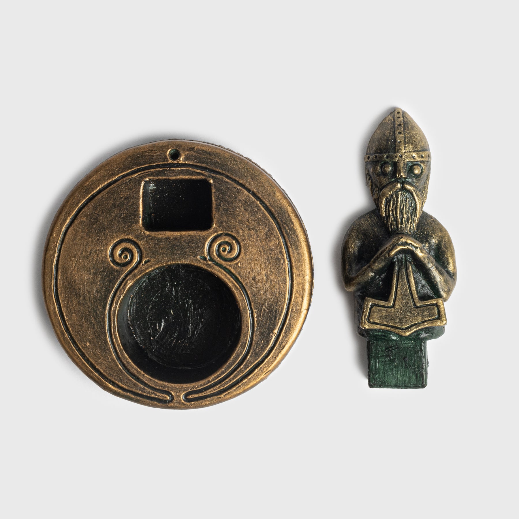 Handgefertigter Reisealtar mit einer Thor-Figur, einem Teelichthalter und einem Räucherstäbchenhalter. Die Figur kann für den einfachen Transport leicht entfernt werden, und auch für den Austausch mit einem anderen Gott aus der Serie.