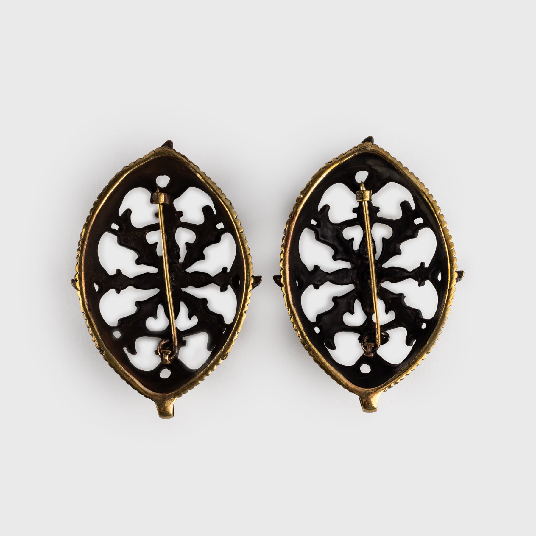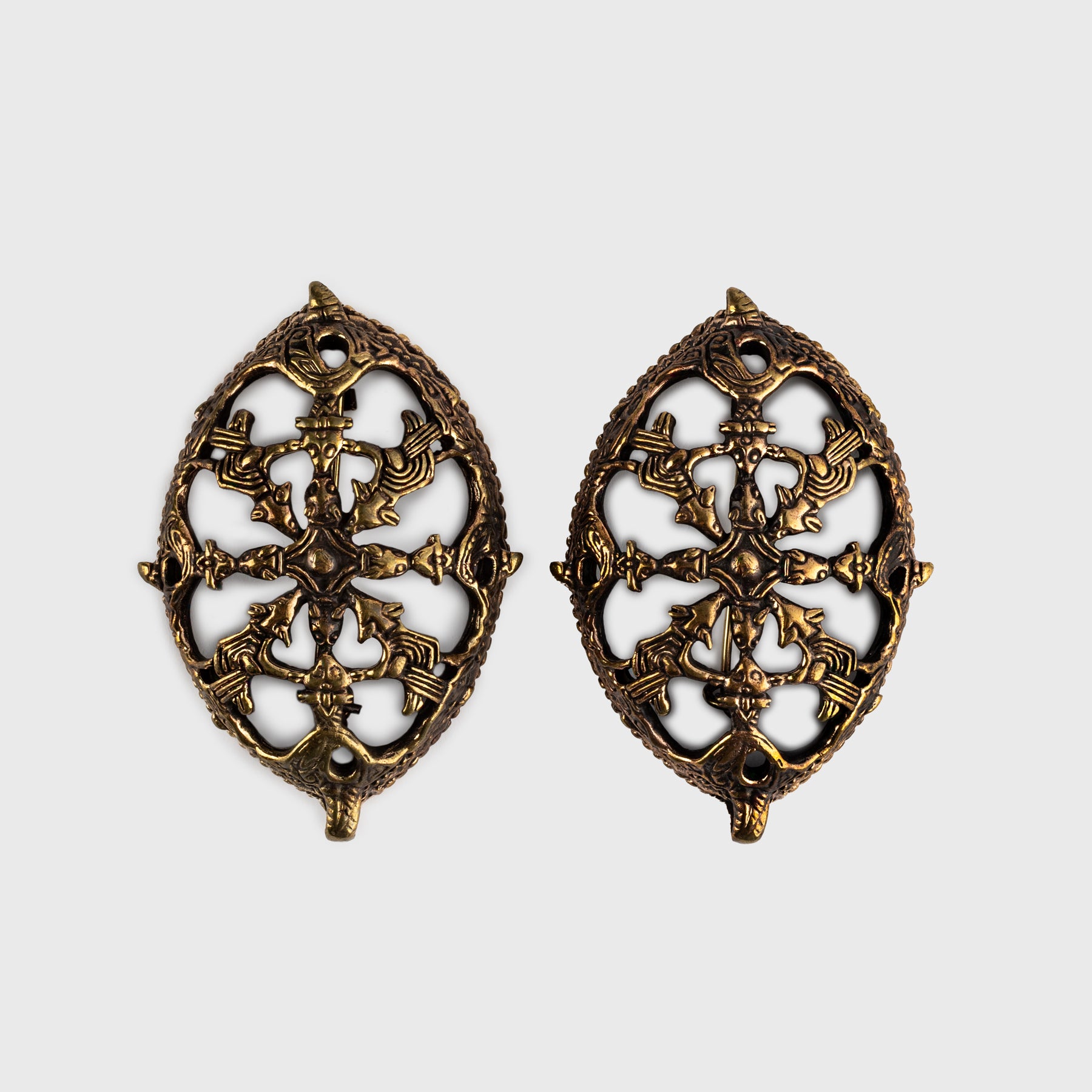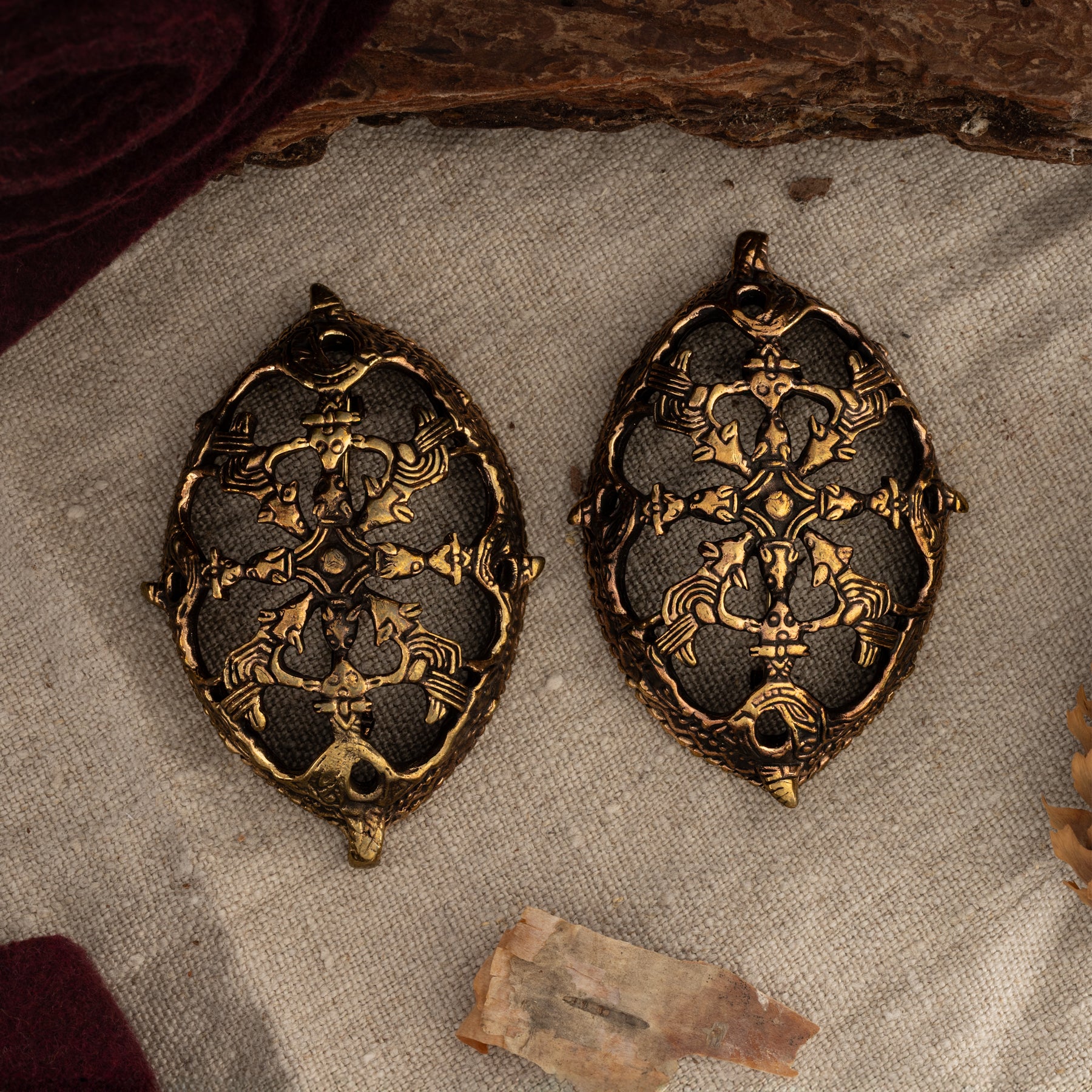 Ein Paar sorgfältig handgefertigter und detaillierter Schalenfibeln von kleiner Größe und geringem Gewicht. Schalenfibeln (Kleidfibeln) werden paarweise an der Vorderseite des Wikingerkleides getragen. Es war üblich, eine Kette mit Perlen und Anhängern dazwischen zu hängen. Kleine Schalenfibeln sind recht praktisch, da sie das Kleid nicht so stark beschweren. Sie wurden auch von Kindern getragen, wie Funde - etwa aus Birka - zeigen.