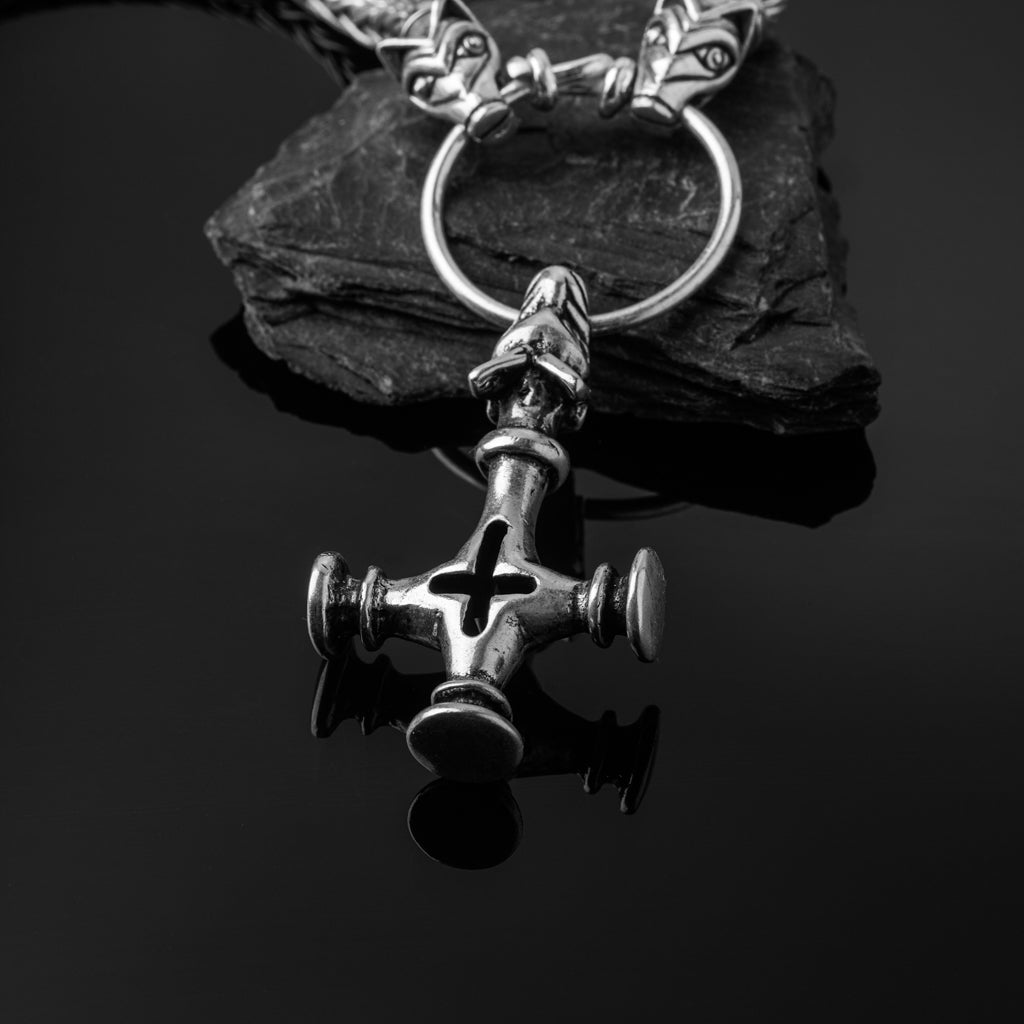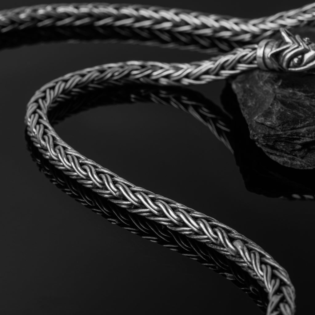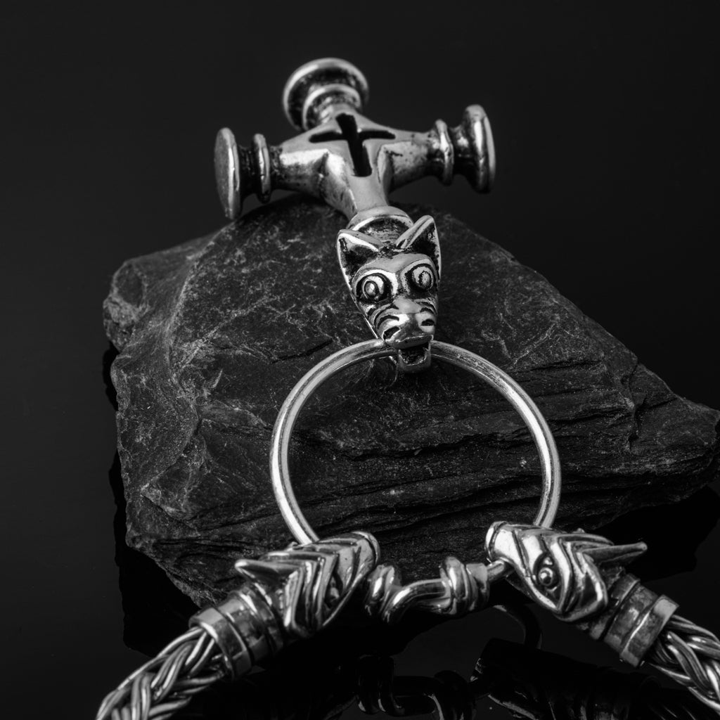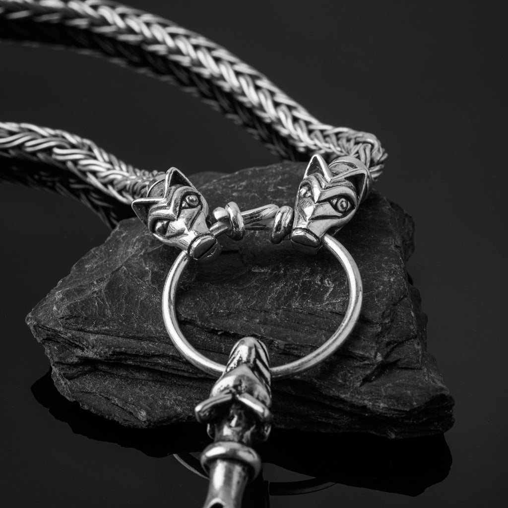 Die Wikinger verwendeten Halsketten mit Tieren oder Bestien, die auf einen Ring bissen, an dem Anhänger hingen. Diese Variante aus geflochtenem Sterlingsilber ist ein wahrhaft majestätisches Stück. Sie endet in den Köpfen von Freki und Geri, die auf einen Anhängerring einer Reproduktion eines isländischen Thors Hammers festbeißen. Ein dritter Wolf beißt auf den Ring mit dem Hammer.