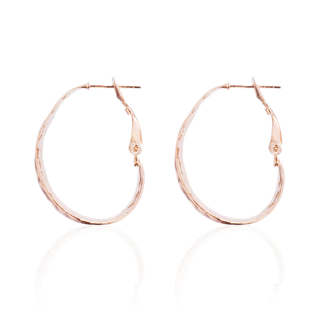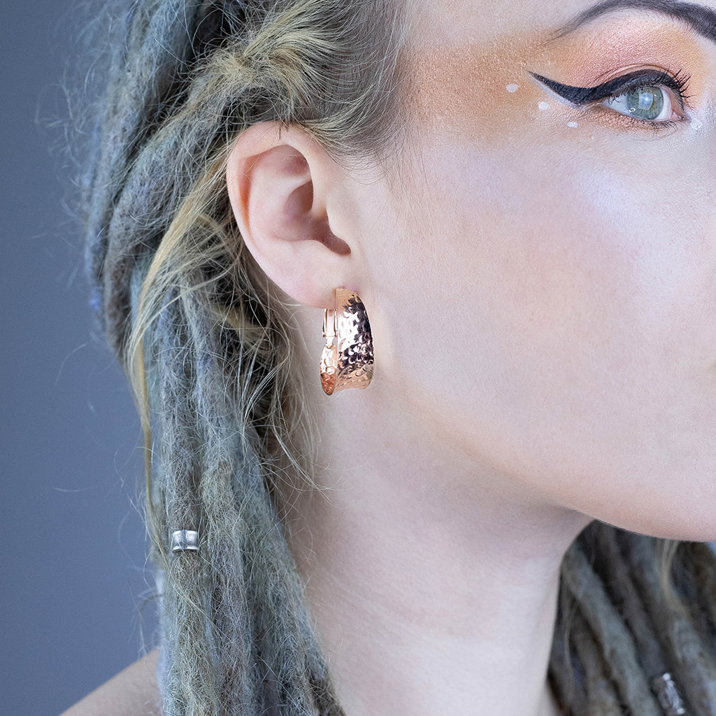 Breite Ohrringe mit einer schönen gehämmerten Oberfläche. Fachmännisch handgefertigt aus massivem 925er Sterlingsilber mit einer 18 Karat Rosévergoldung, werden sie garantiert gefallen.
