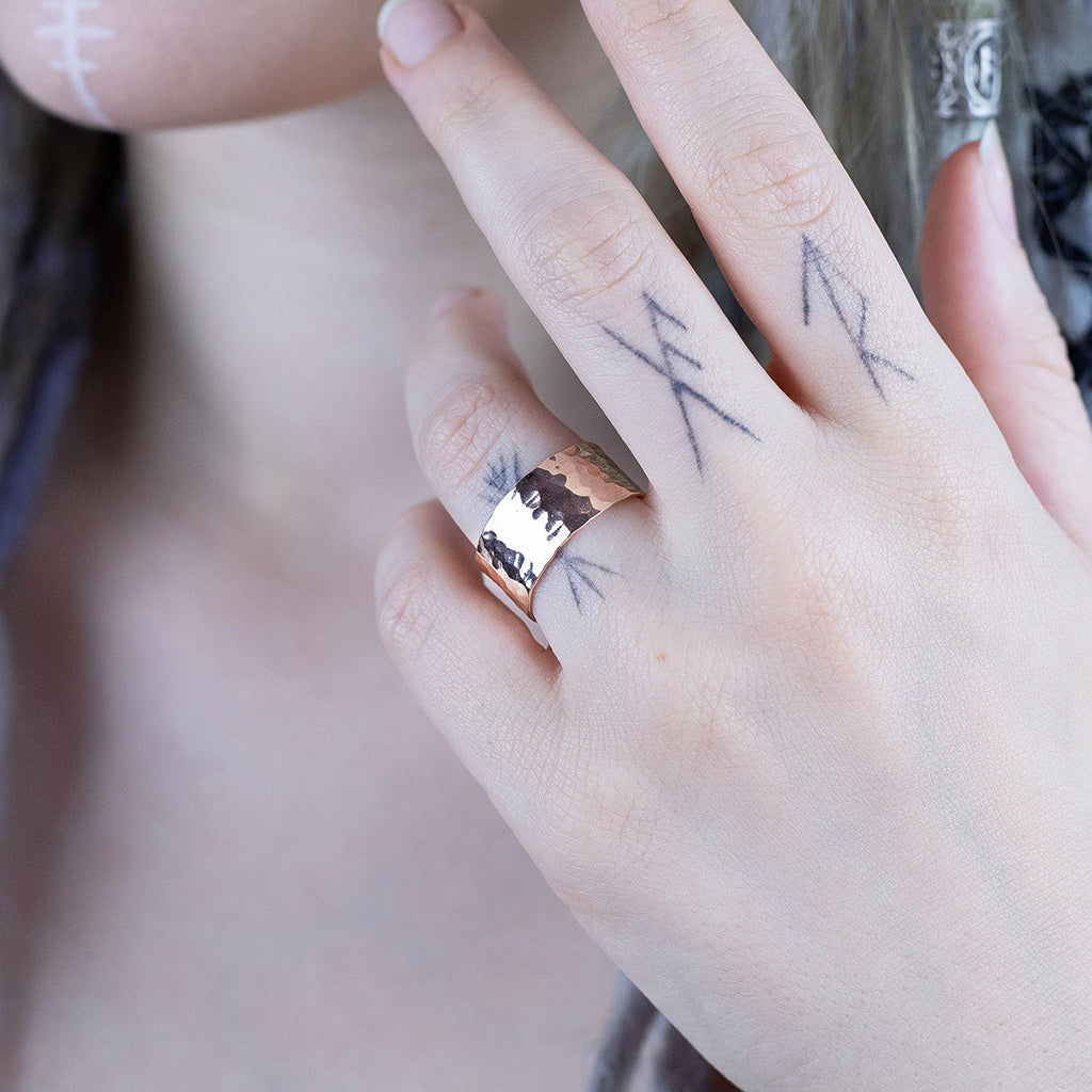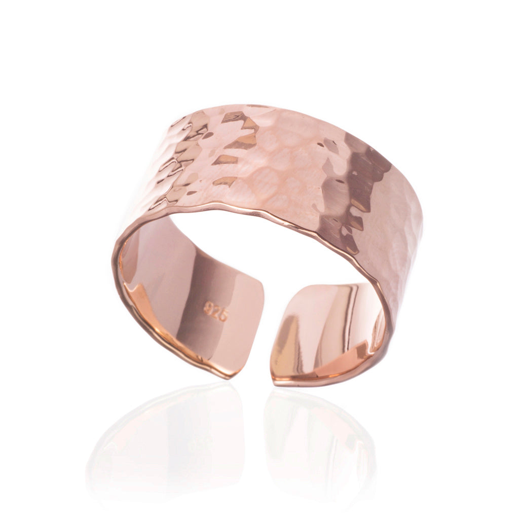 Ein breiter, offener Ring mit einer schönen gehämmerten Oberfläche. Fachmännisch handgefertigt aus massivem 925er Sterlingsilber mit einer 18 Karat Rosévergoldung, wird er garantiert gefallen.