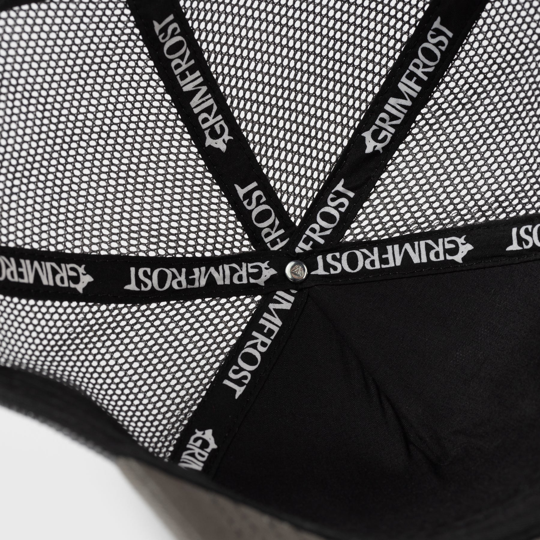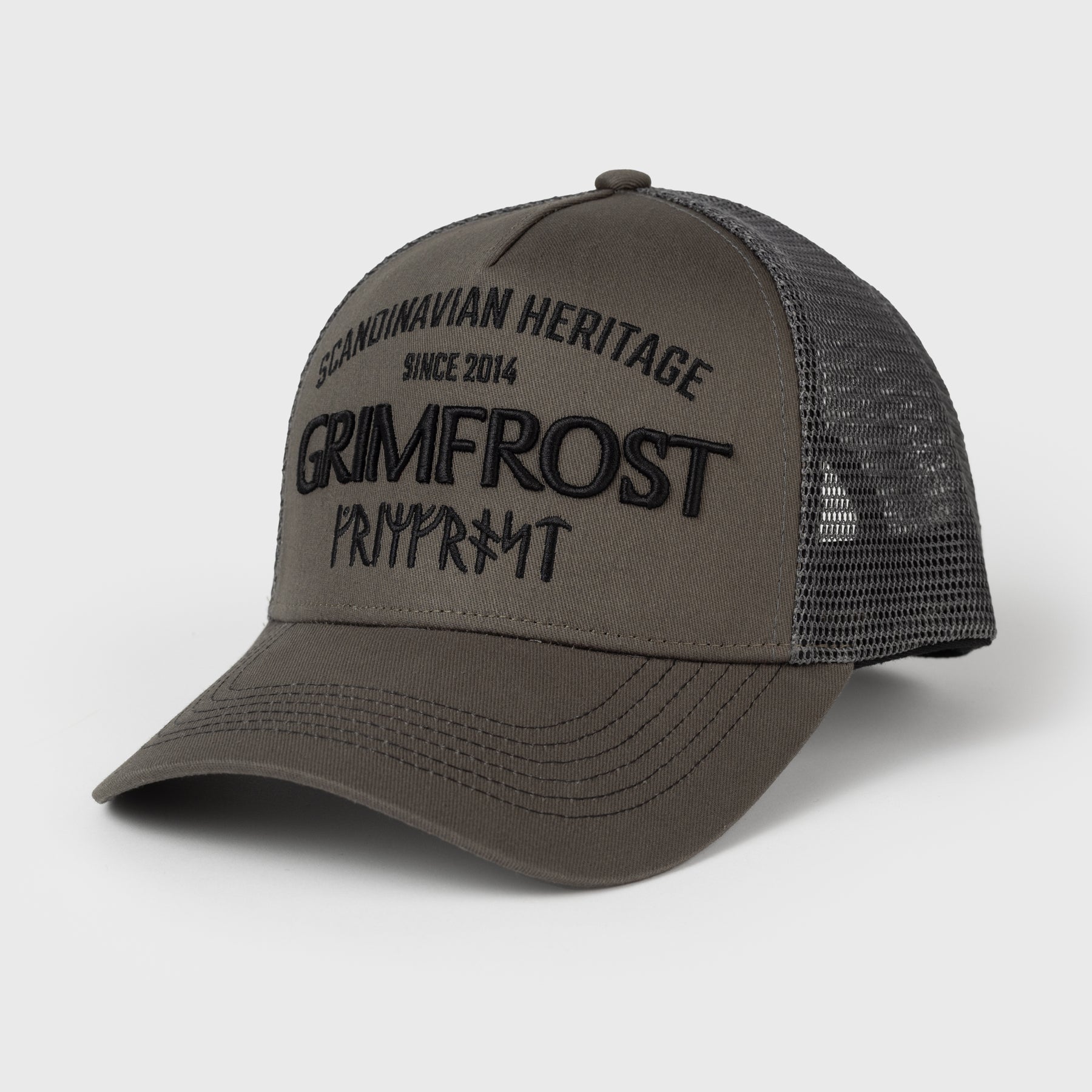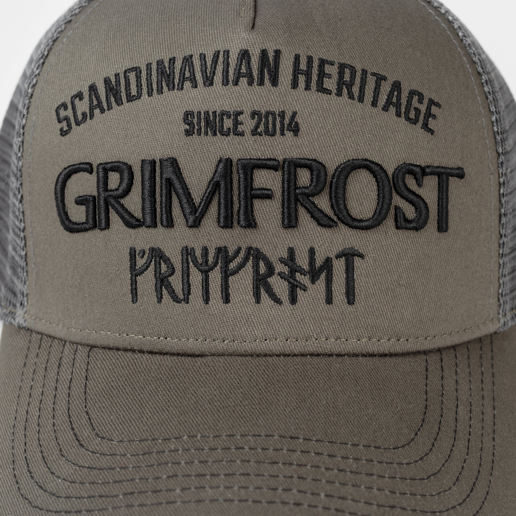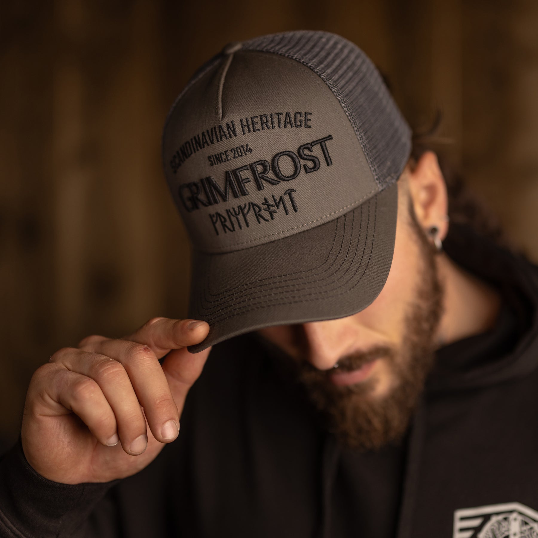 Hochwertiger strukturierter Trucker Cap mit Netzeinsätzen. Auf der Vorderseite ist "Grimfrost", ebenfalls in Runen, zusammen mit "Scandinavian Heritage since 2014" aufgestickt. Die Innenseite ist mit Tricot-Köpergewebe gefüttert, das für hervorragenden Komfort und Atmungsaktivität sorgt.