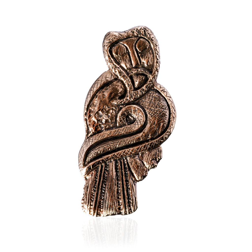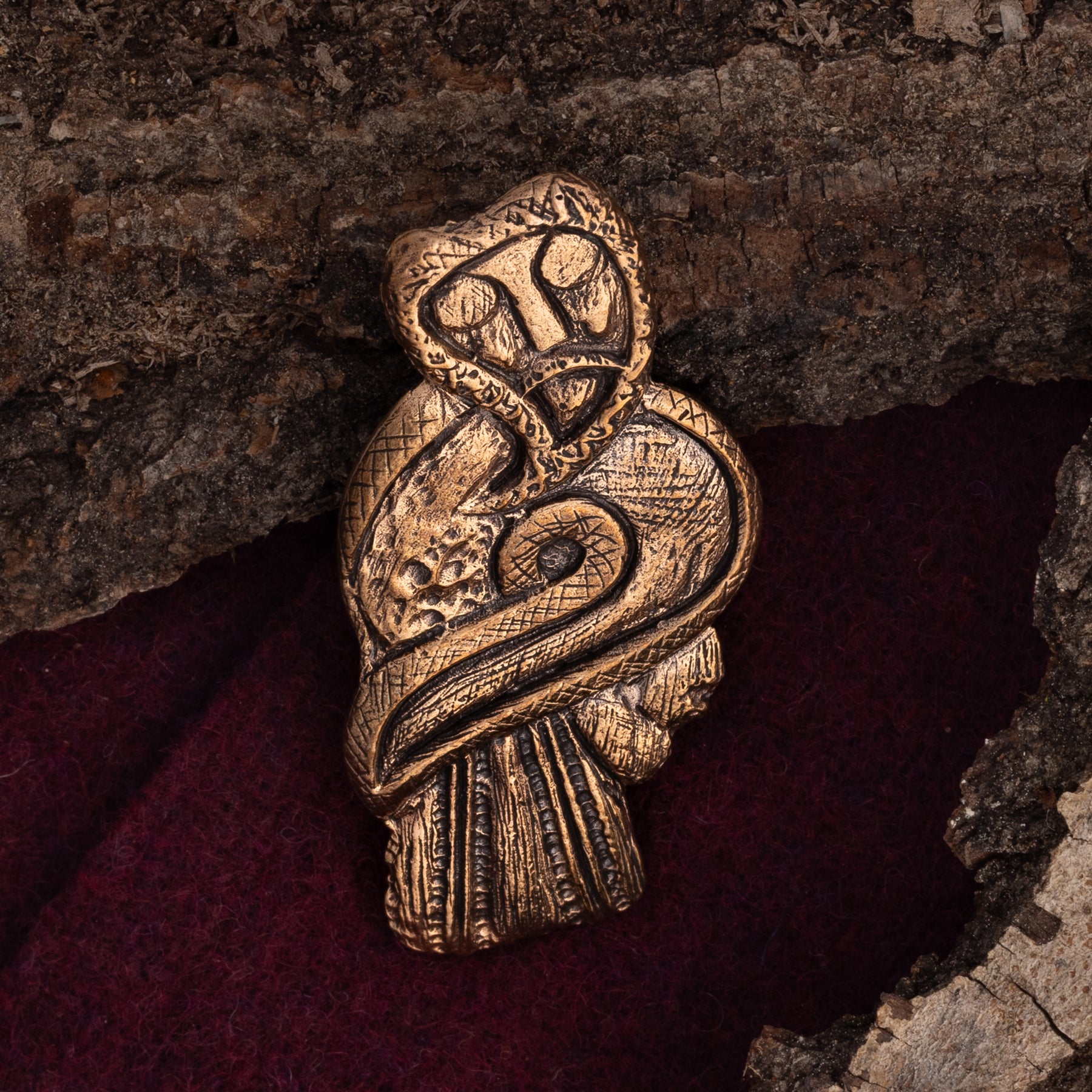 Eine Reproduktion aus massiver Bronze der erstaunlichen Vogelmann-Silberfibel, die 2019 in Dänemark gefunden wurde. Sie könnte Völund, den Schmied, oder Loki darstellen, aber da es viele Wesenheiten gibt, die sich der Fähigkeit bedienen, sich in einen Vogel zu verwandeln, könnte sie auch Suttung oder Odin darstellen.