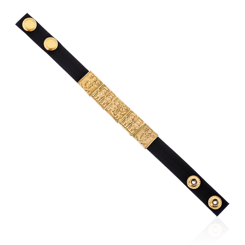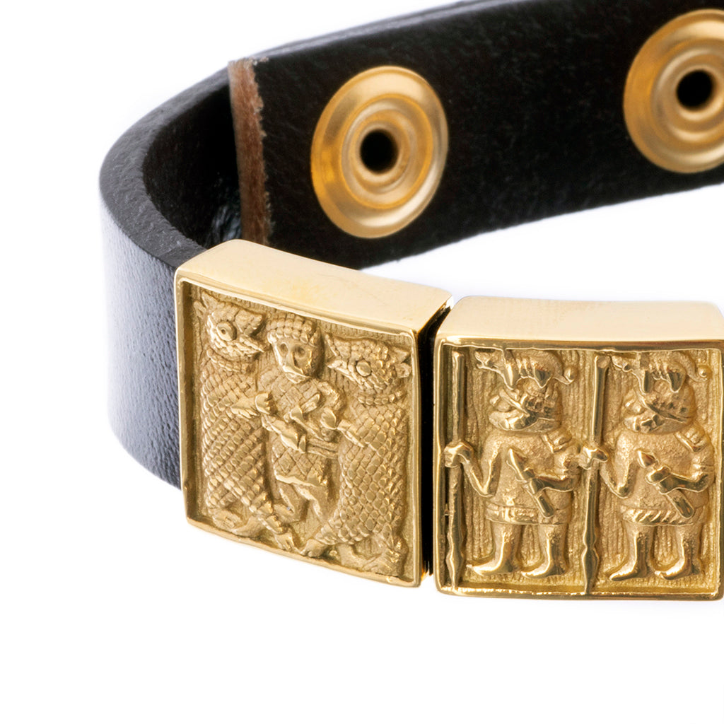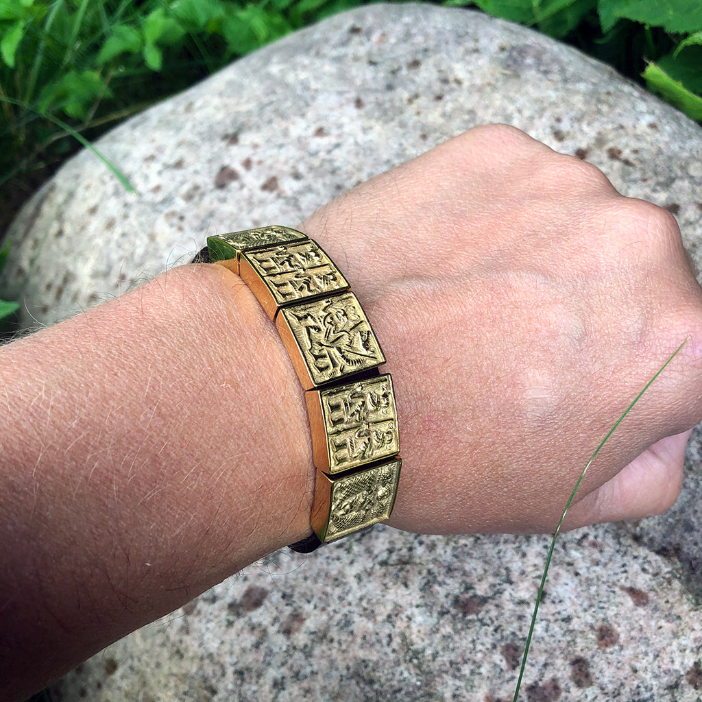 Lederarmband mit fünf Platten, die den alten Torslunda-Bronzeplatten nachempfunden sind. Sie datieren auf die 550-800 n. Chr. und zeigen Szenen aus Märchen und Mythologie. Die Platten des Armbands sind: