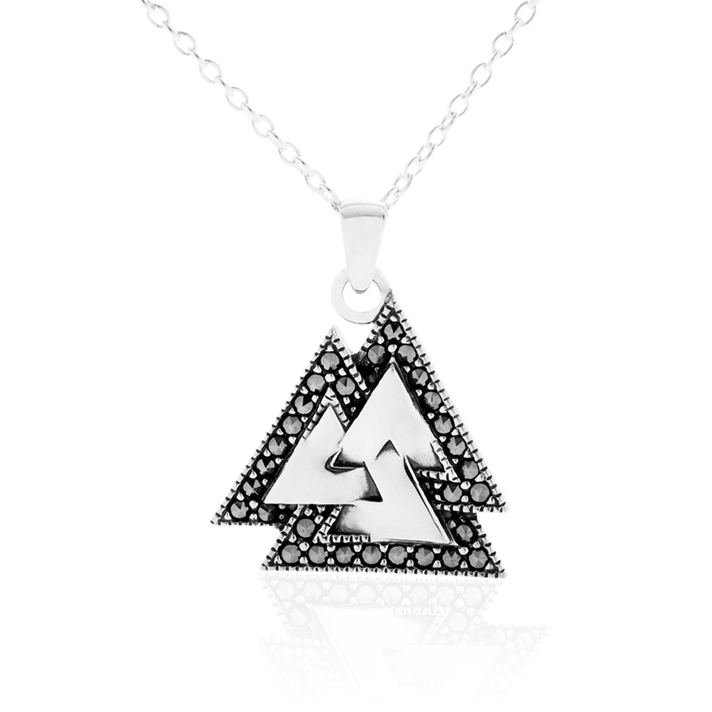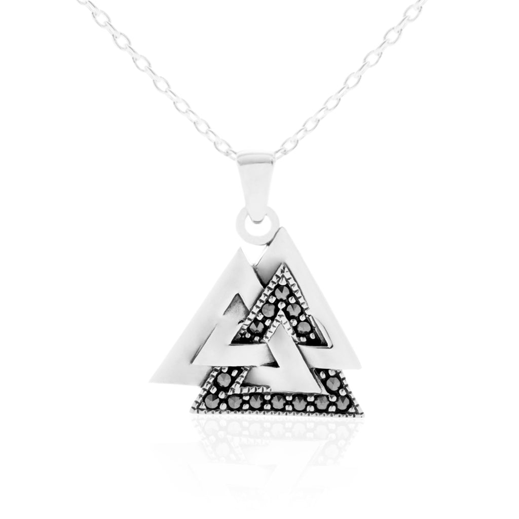 Ein wunderschöner Anhänger aus massivem 925er Sterlingsilber mit Markasitsteinen, fachmännisch handgefertigt. Er basiert auf dem Valknut-Symbol, das mit Odin, dem Häuptling der Wikingergötter, verbunden ist. Er wohnt in Walhall, wohin die Auserwählten in ihrem Leben nach dem Tod reisen. Inklusive Kette.