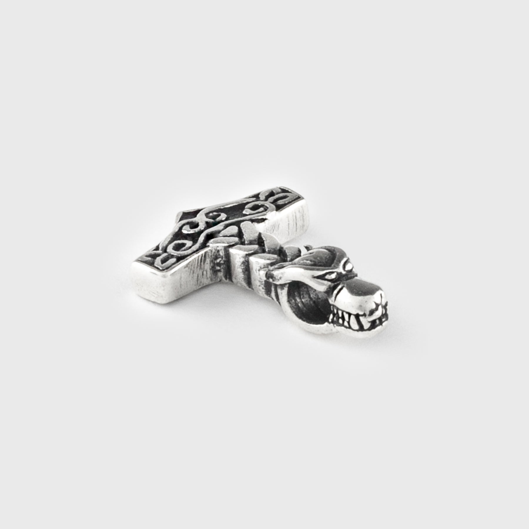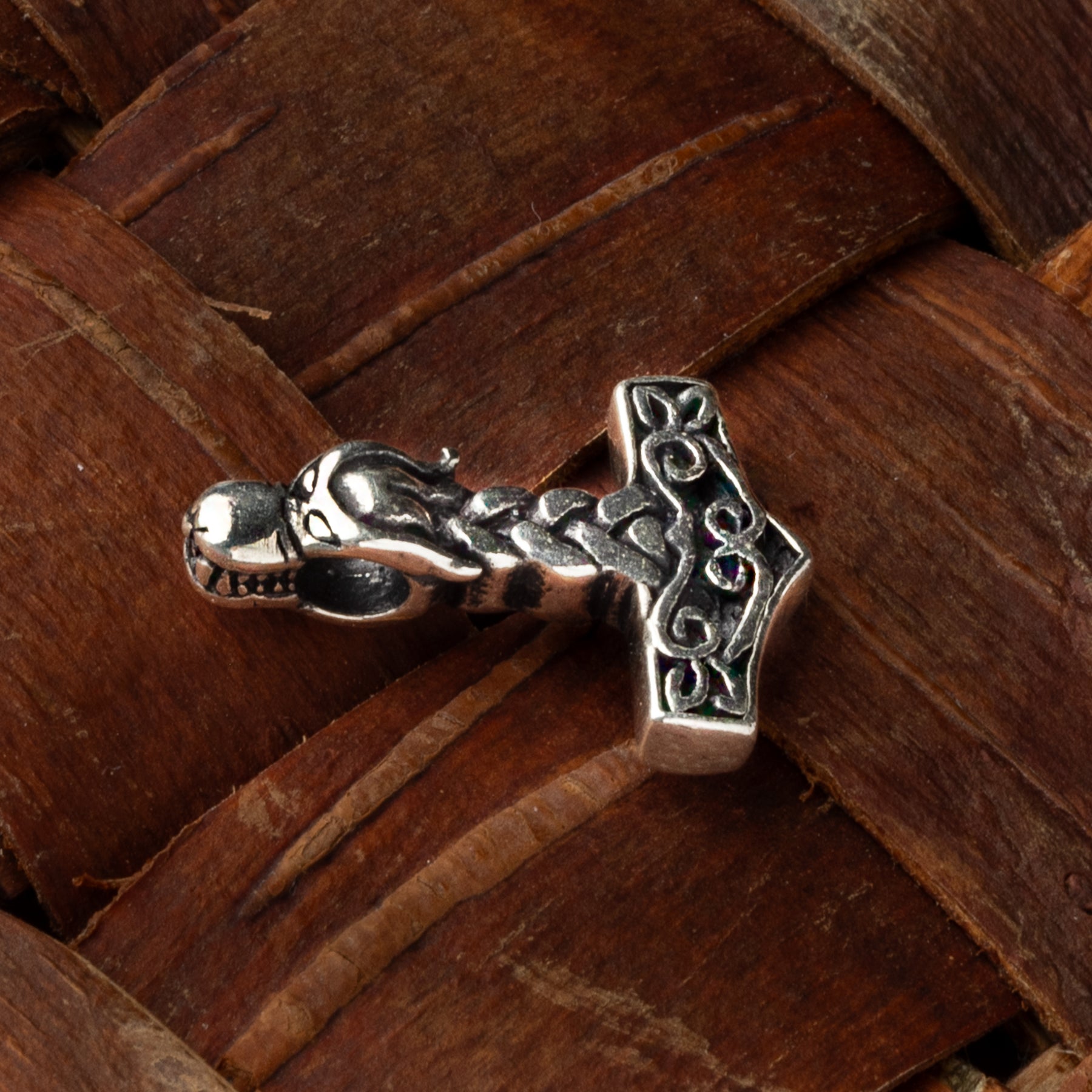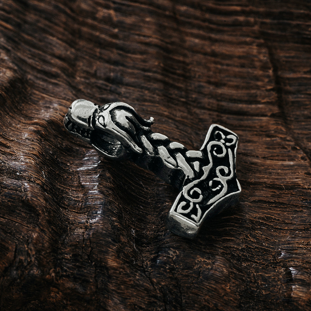 Kleiner, sorgfältig handgefertigter Thorshammer mit einem Drachenkopf.