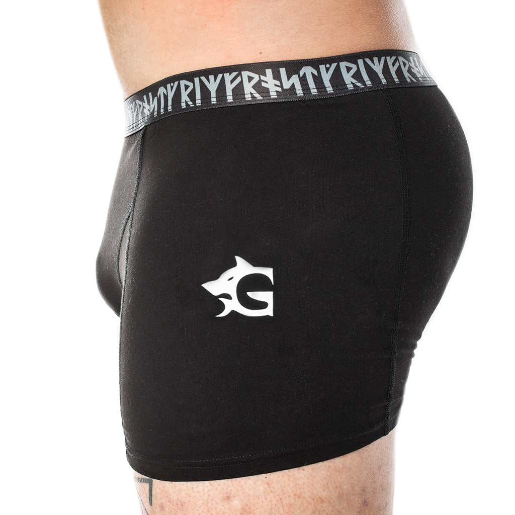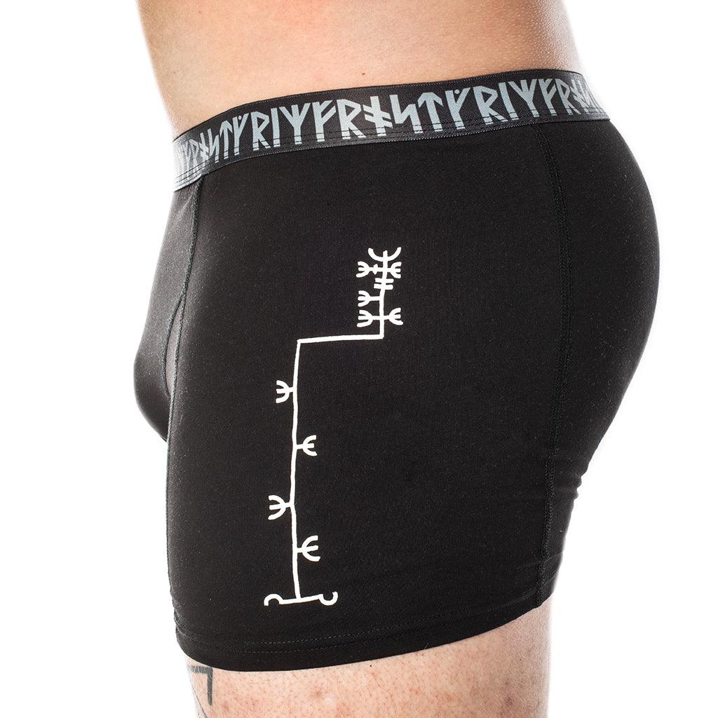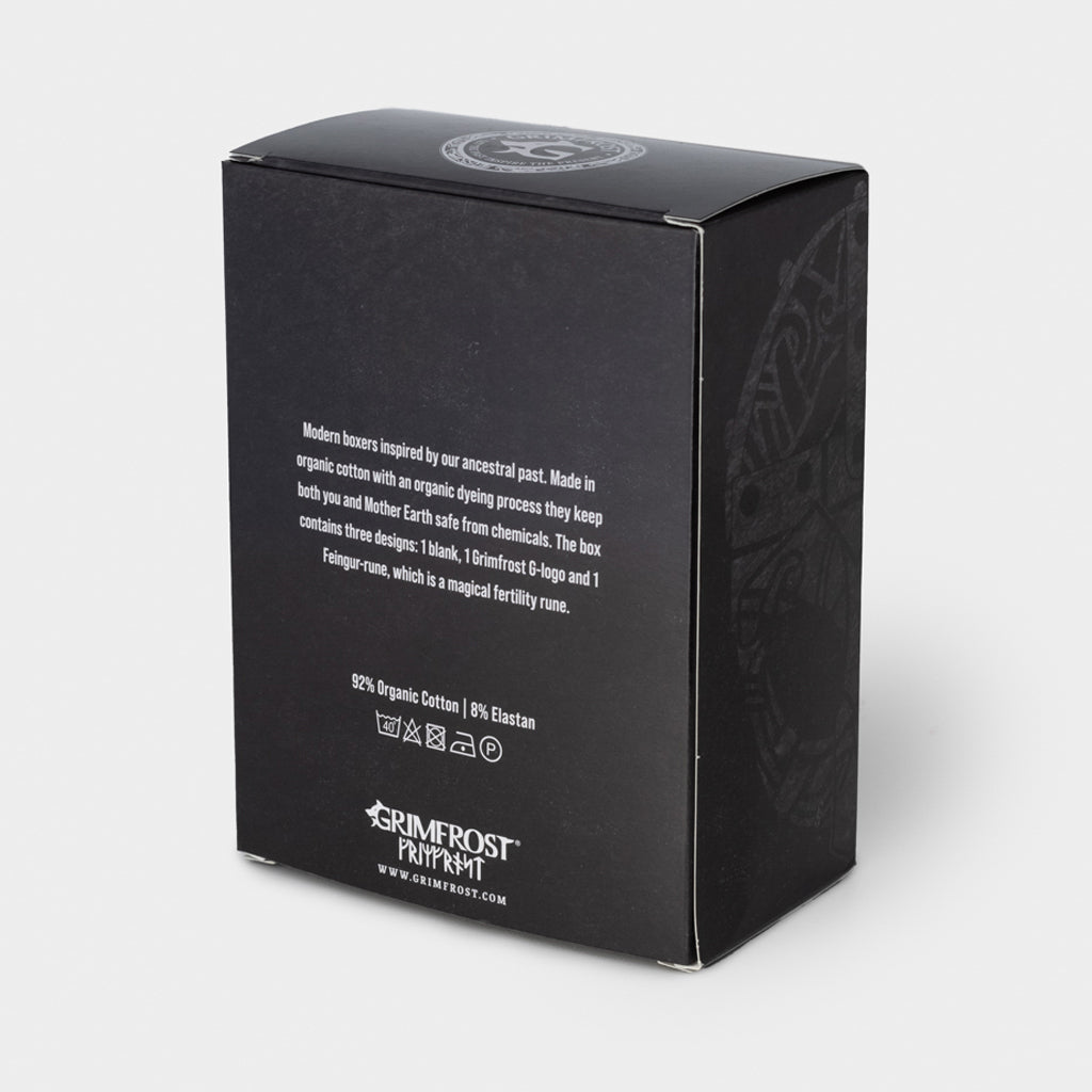 Weiche und atmungsaktive Boxershorts, inspiriert von der Vergangenheit unserer Vorfahren. Der leichte Stretch macht jede Bewegung mit und sorgt für ultimativen Komfort. Die Boxershorts sind aus Bio-Baumwollstretch mit einem Bio-Färbeverfahren hergestellt. Das ist sowohl für Sie als auch für Mutter Erde gut. Die Schachtel enthält drei Designs: 1 Blanko, 1 Grimfrost G-Logo und 1 Feingur-Rune, eine magische Libido/Fruchtbarkeitsrune. Der elastische Bund ist mit dem Runen-Logo von Grimfrost versehen.
