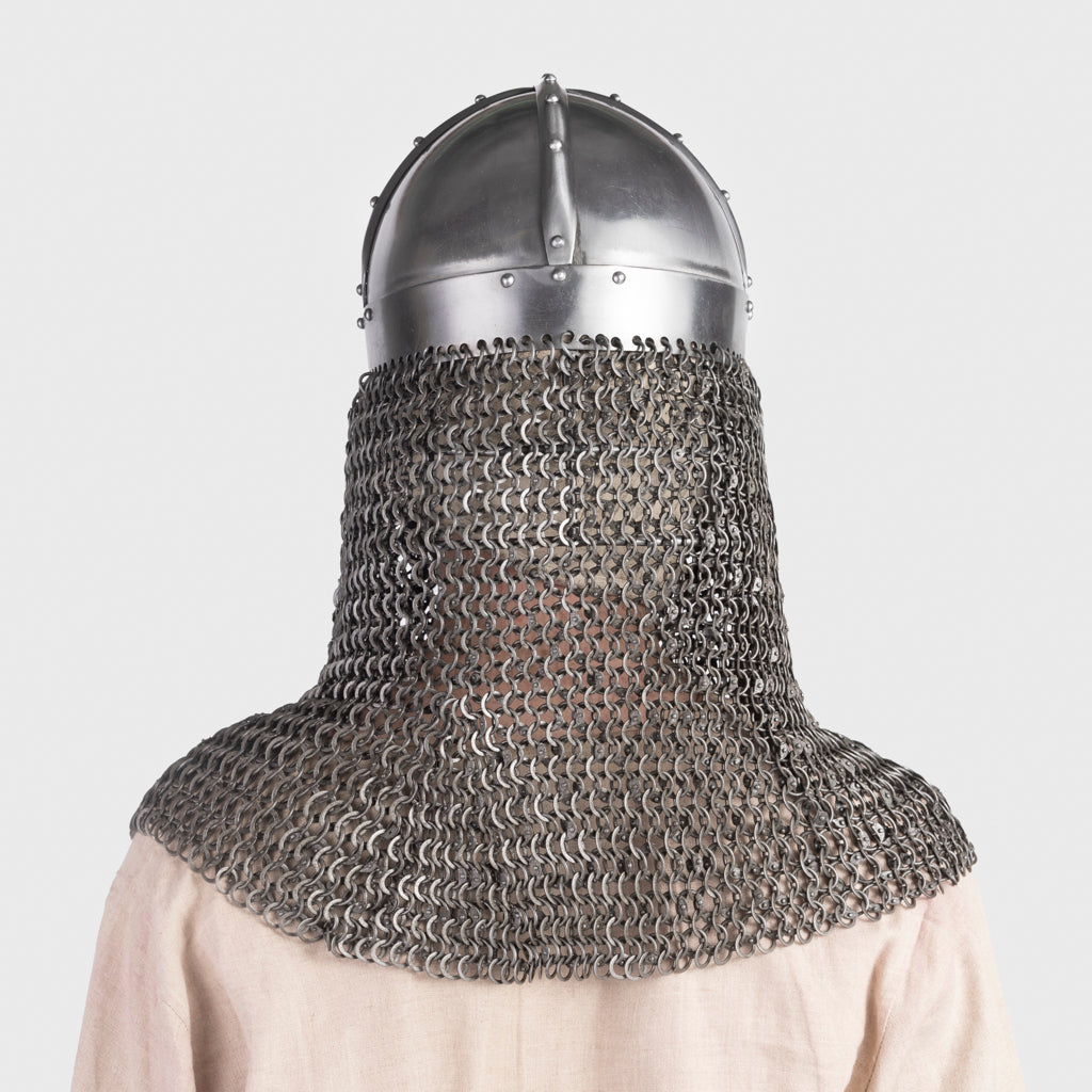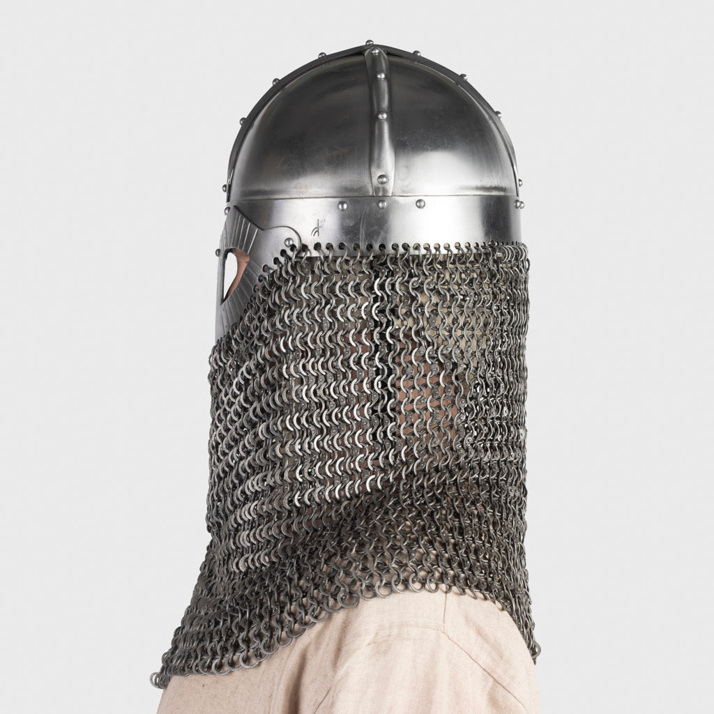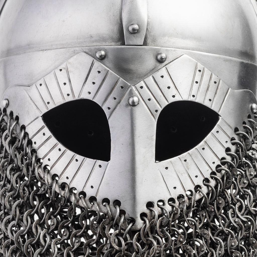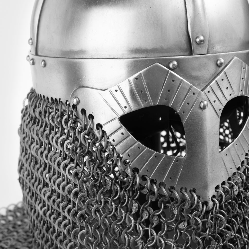 Der Helm ist mit einem schützenden Stahlkäfig ausgestattet, der hinter einem umschließenden, vernieteten Kettenbrünne verborgen ist. Der Käfig bietet zusätzlichen Schutz für die Bereiche unterhalb des Helmrandes. Mit authentischem Design, ist dieser Helm perfekt für Vollkontakt-Wikingerkämpfer, die ein gutes, schützendes Stück suchen.