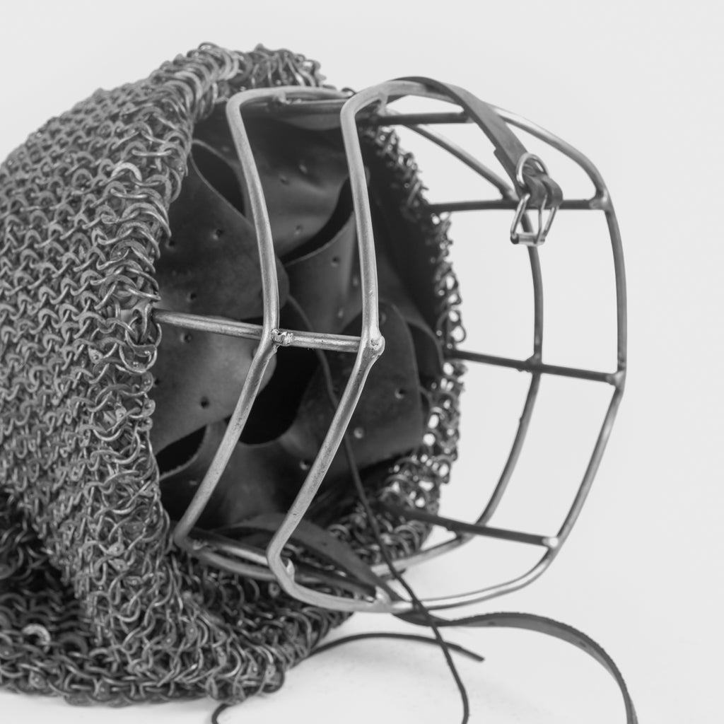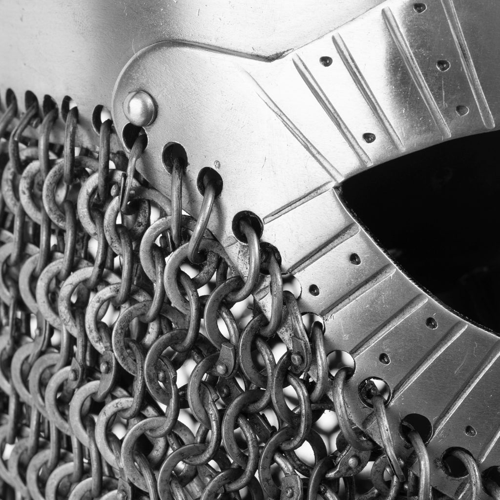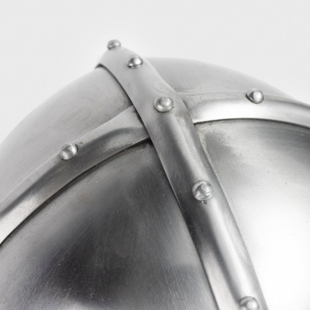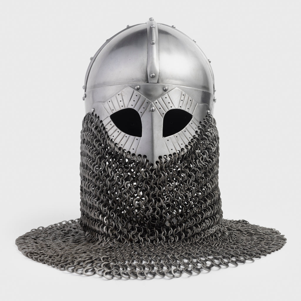 Der Helm ist mit einem schützenden Stahlkäfig ausgestattet, der hinter einem umschließenden, vernieteten Kettenbrünne verborgen ist. Der Käfig bietet zusätzlichen Schutz für die Bereiche unterhalb des Helmrandes. Mit authentischem Design, ist dieser Helm perfekt für Vollkontakt-Wikingerkämpfer, die ein gutes, schützendes Stück suchen.