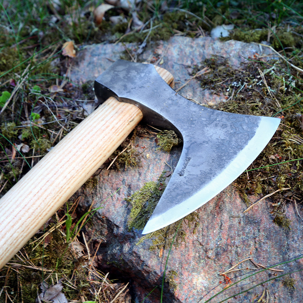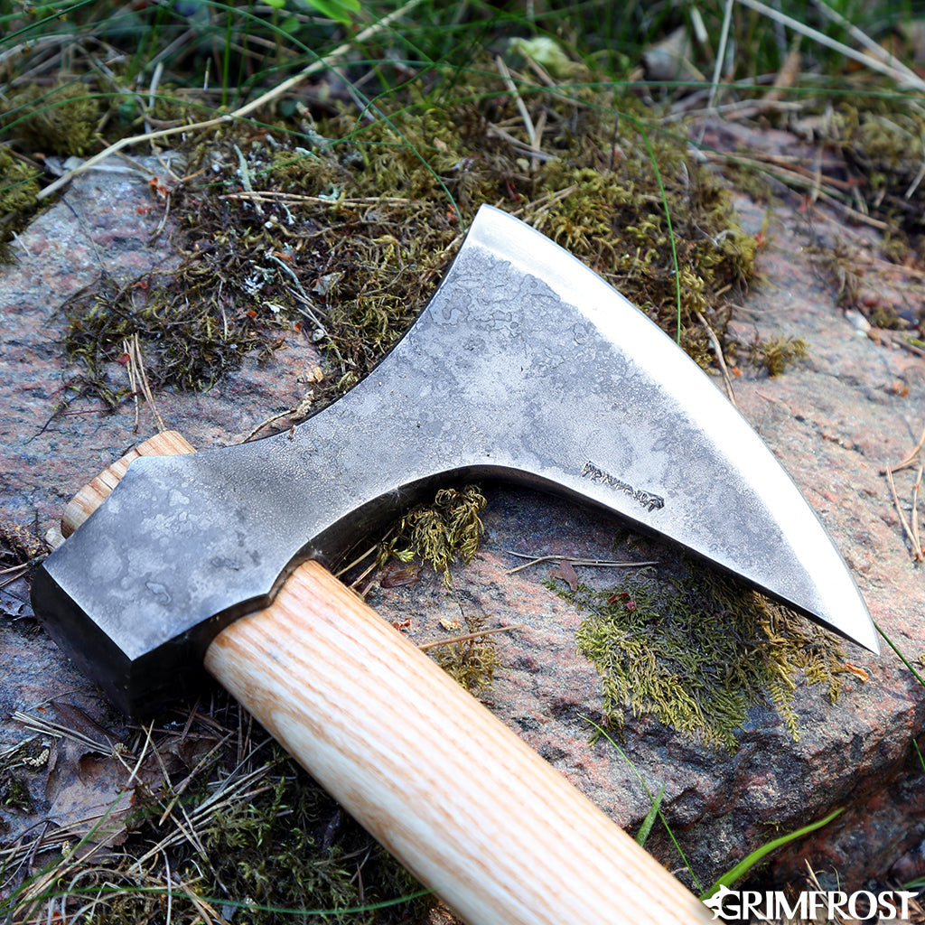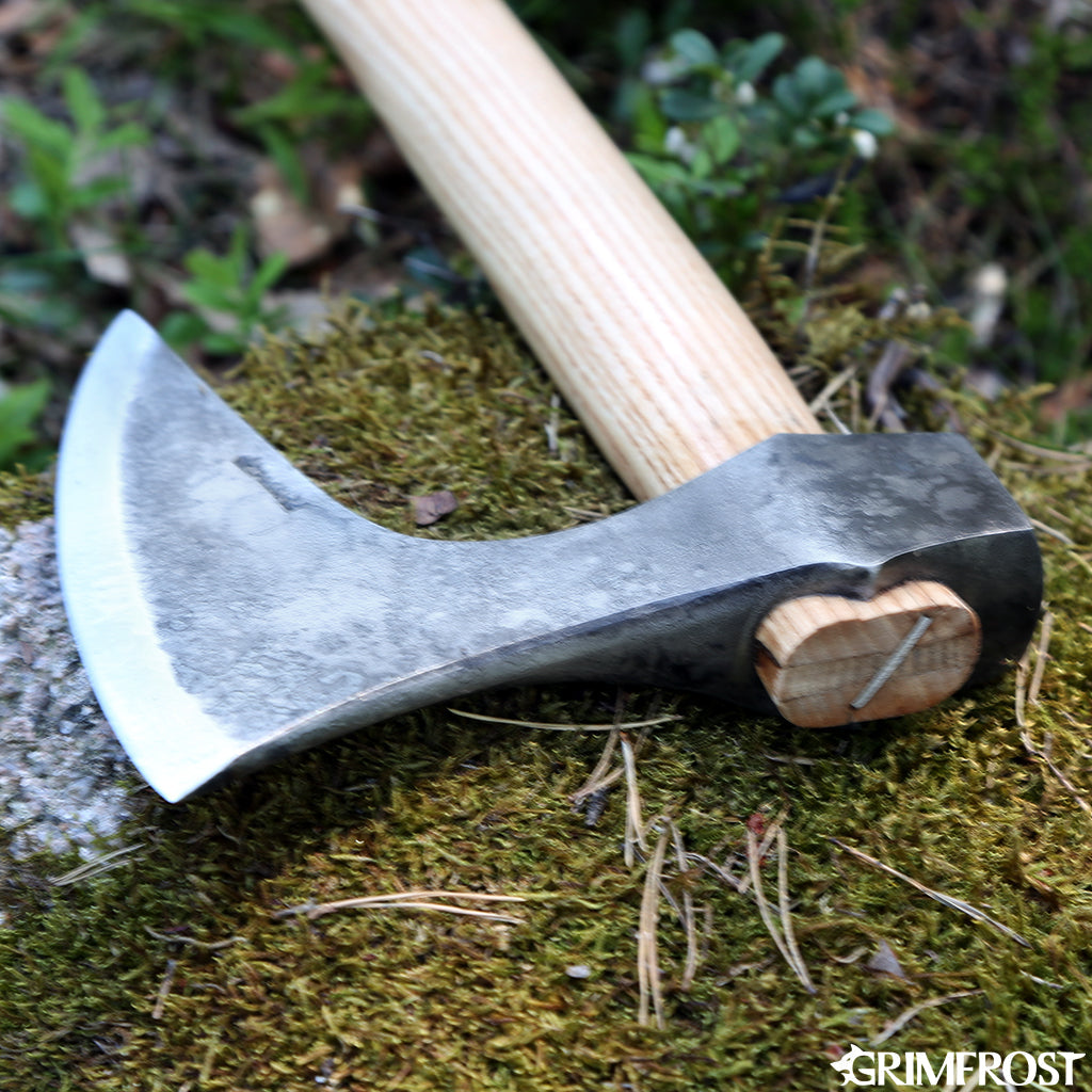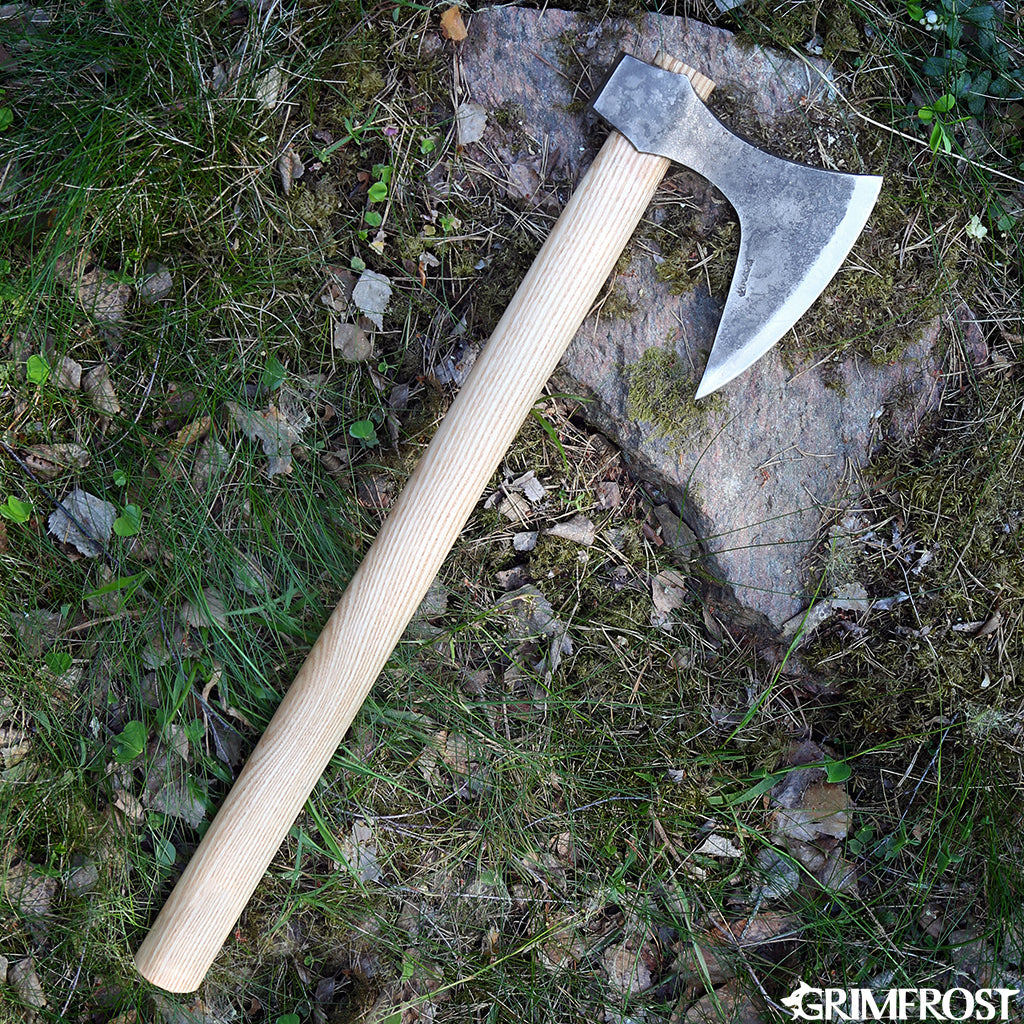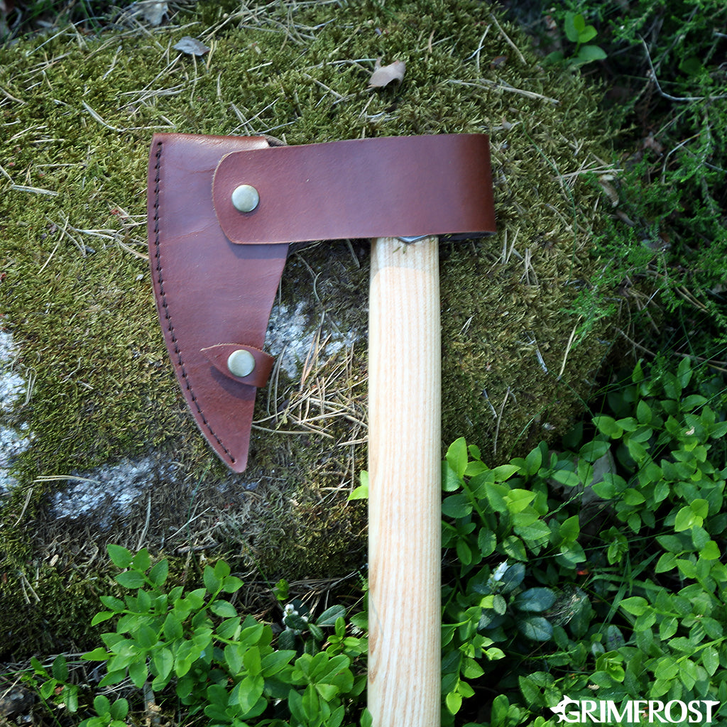 Grimfrosts Skeggox (altnordisch: Bartaxt) ist eine einhändige Axt, die während der gesamten Wikingerzeit in Gebrauch war. Der Name leitet sich von dem verlängerten unteren Teil des Axtkopfes ab, der eine breite Schneidefläche bietet, ohne das Gesamtgewicht zu erhöhen. Der verlängerte Teil eignet sich auch sehr gut zum Auffangen von Schilden und Waffen. Auf der geschliffenen Klinge ist Grimfrost in Runen als "Herstellermarke" eingeprägt. Der Schaft ist aus unbehandeltem, poliertem Eschenholz, das mit Leinöl oder anderen Mitteln Ihrer Wahl behandelt werden kann. Ein handgenähter Lederschutz ist im Lieferumfang enthalten. Die Druckknöpfe können entfernt und durch Lederbänder ersetzt werden, um eine historisch korrekte Version zu erhalten.