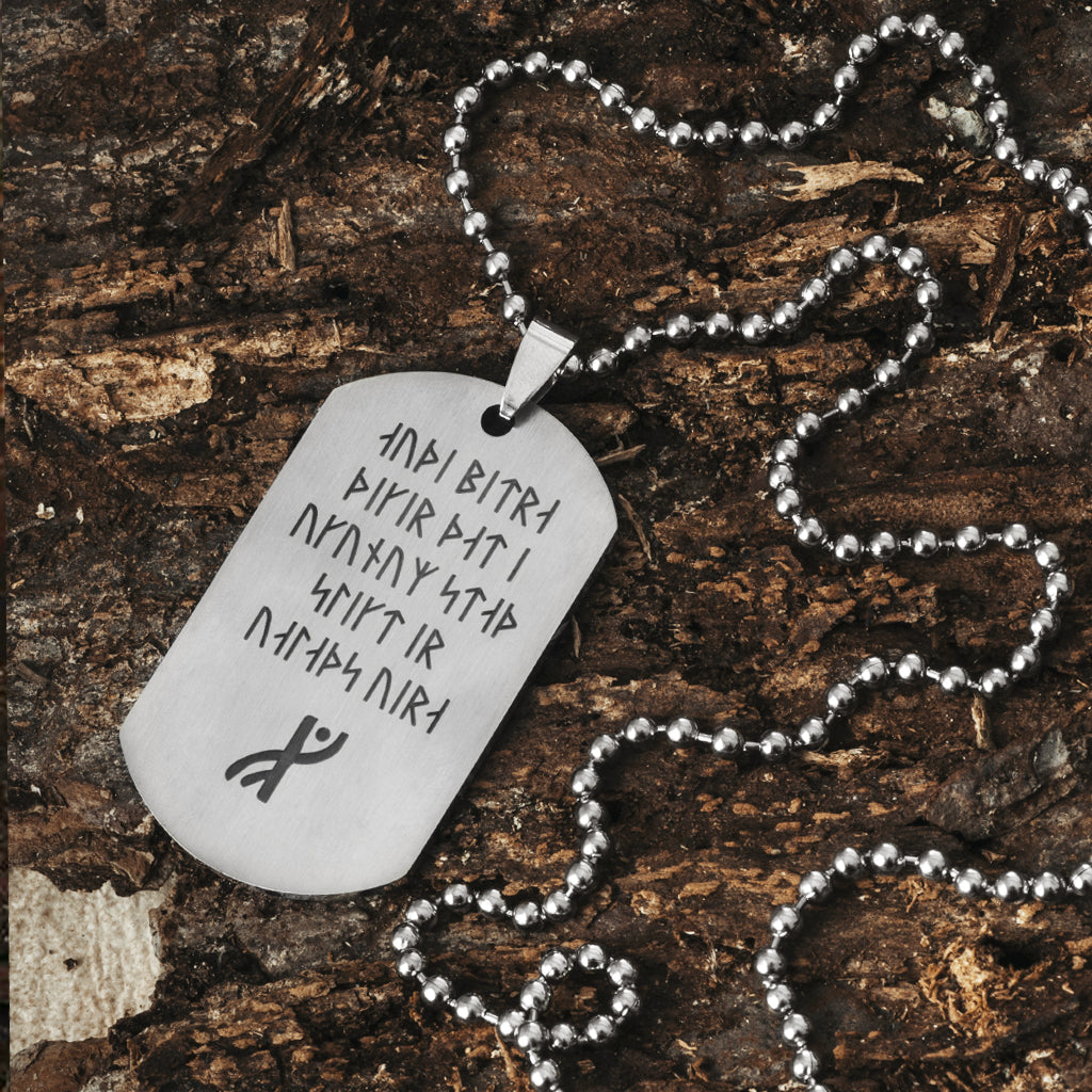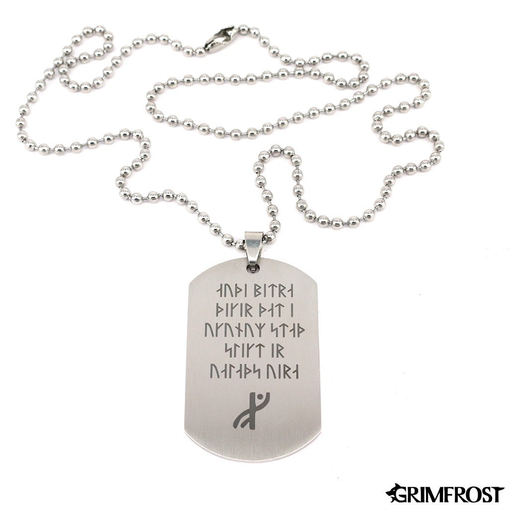 Tragen Sie die alte Weisheit der Wikinger um den Hals mit dieser Erkennungsmarke aus gebürstetem, mattem Edelstahl. Strophe 10 aus dem Hávamál ist auf beiden Seiten mit Runen geschrieben. Aus dem Altnordischen übersetzt bedeutet dies: