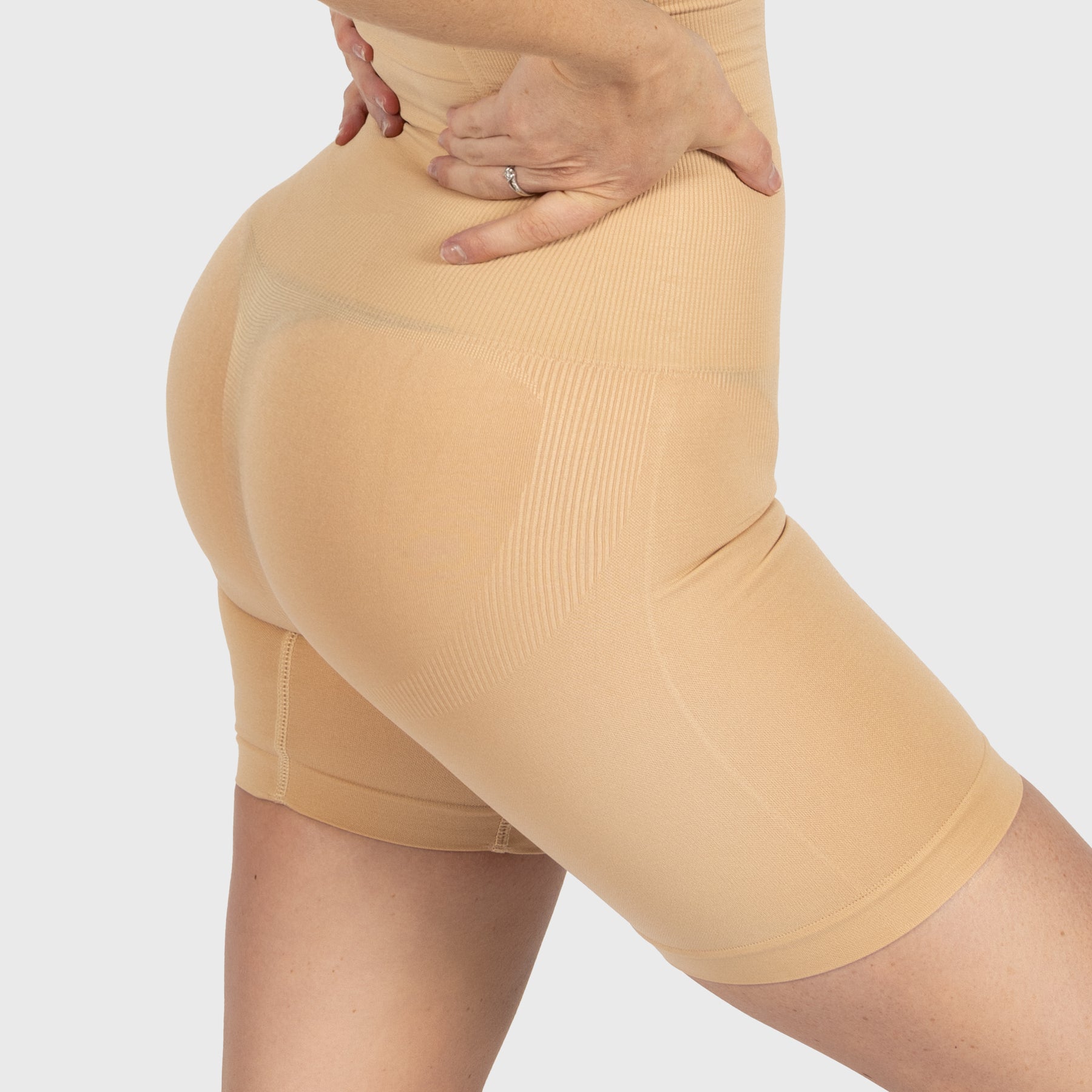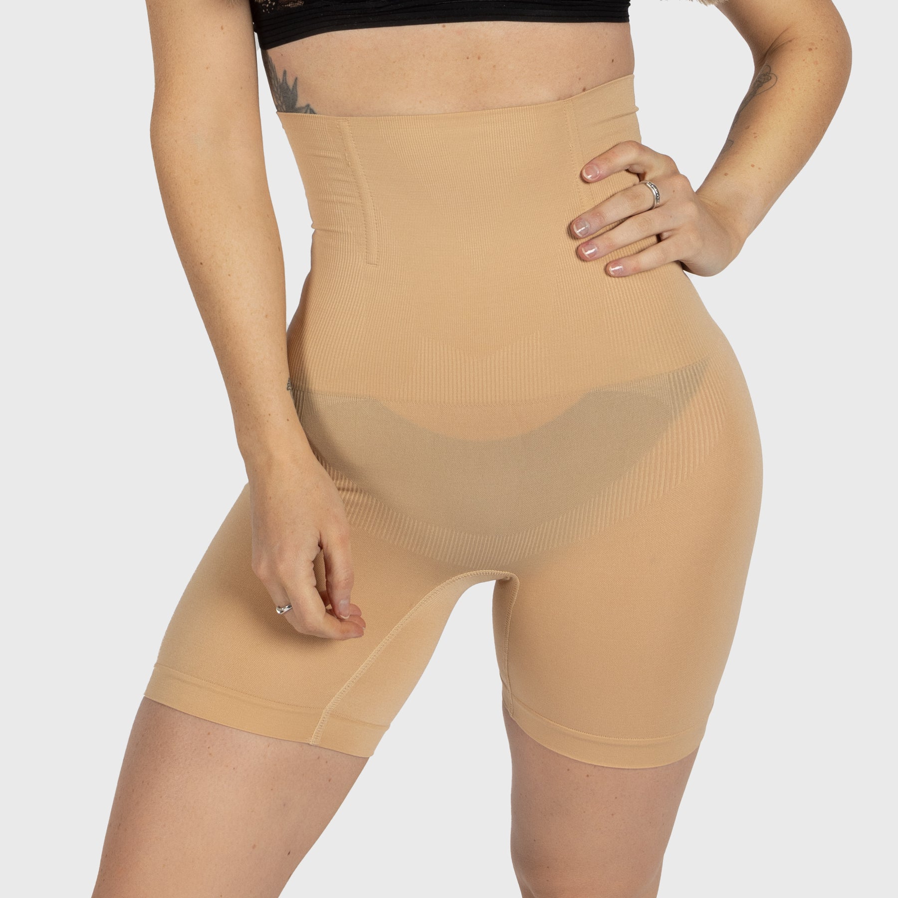 • Unterbrustband mit innenliegendem Silikon zur Verhinderung des Einrollens, Kompression auf mittlerem Niveau entlang von Bauch und Taille, trifft auf die Mitte der Oberschenkel, doppellagige Kompression und Unterstützung entlang der Oberschenkel, die nicht einschneidet, Gesäßtaschen zum Anheben und Definieren des Gesäßes, offener Zwickel