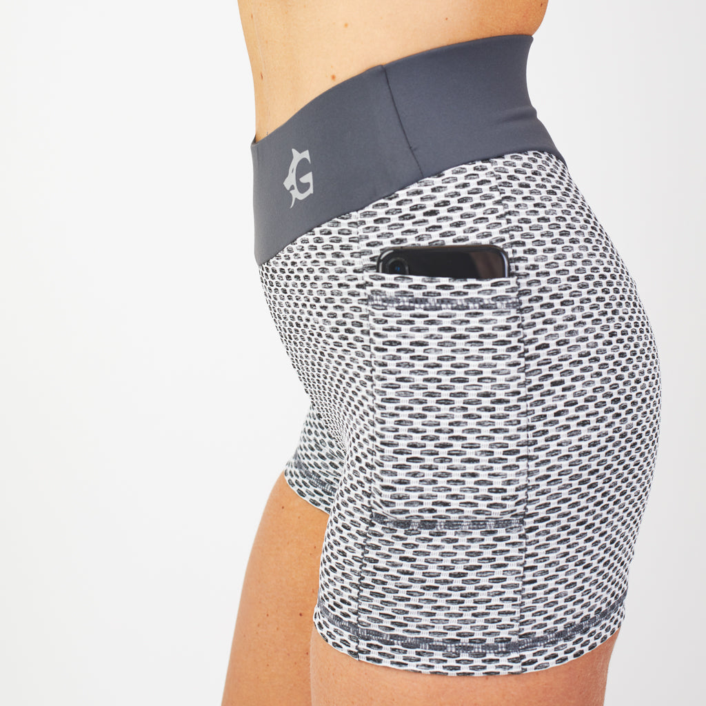 Weiche und bequeme Shorts mit hoher Taille und einem gerippten Wabenmuster. Die Shorts sind mit einer definierenden, zerknitterten Naht versehen, die in der hinteren Mitte verläuft und die Form Ihres Hinterns hebt und akzentuiert. Die Wabenstruktur verdeckt auch Grübchen und Cellulite.