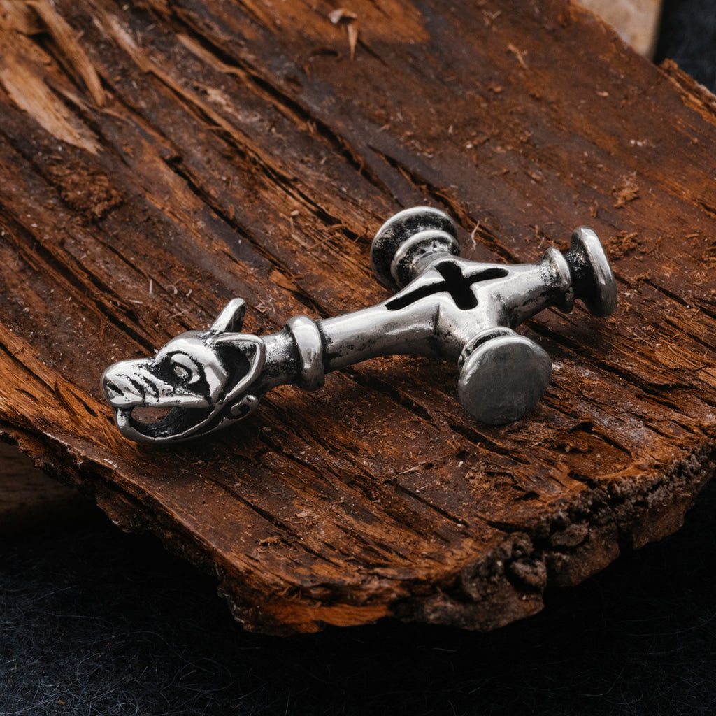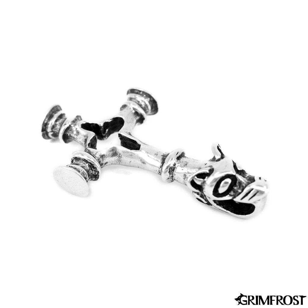 Reproduktion eines isländischen Thorshammers aus massivem Sterlingsilber, mit einem Wolf, der in die Kette oder Schnur beißt. Der Originalfund wird auf die 900er Jahre datiert.