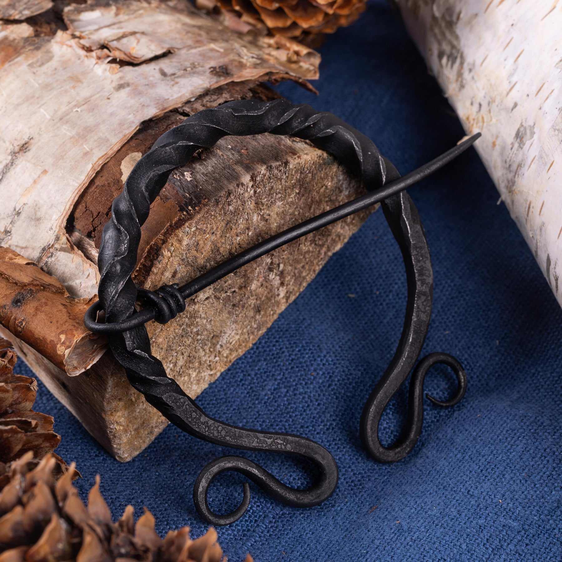 Eine Fibel ist eine Anstecknadel oder Brosche, mit der die Wikinger ihre Kleidungsstücke befestigten. Diese hier ist aus gedrehtem Eisen handgeschmiedet und eignet sich gut für Umhänge und andere größere Kleidungsstücke.