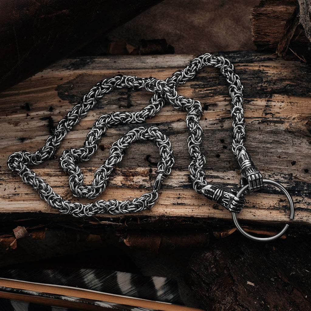 Die Wikinger verwendeten Halsketten mit Tieren oder Bestien, die auf einen Ring bissen, an dem Anhänger hingen. Diese Variante besteht aus einer King Chain, die in Járngreipr, den eisernen Fehdehandschuhen von Thor, endet, die den Anhängerring halten. Auf den Handschuhen steht mit Runen "THOR VIKI" geschrieben, was übersetzt "Thor schütze/segne" bedeutet. Wie der Name schon sagt, handelt es sich um den König aller Ketten, die bei den Wikingern als Zeichen des Erfolgs und der Macht angesehen wurde.