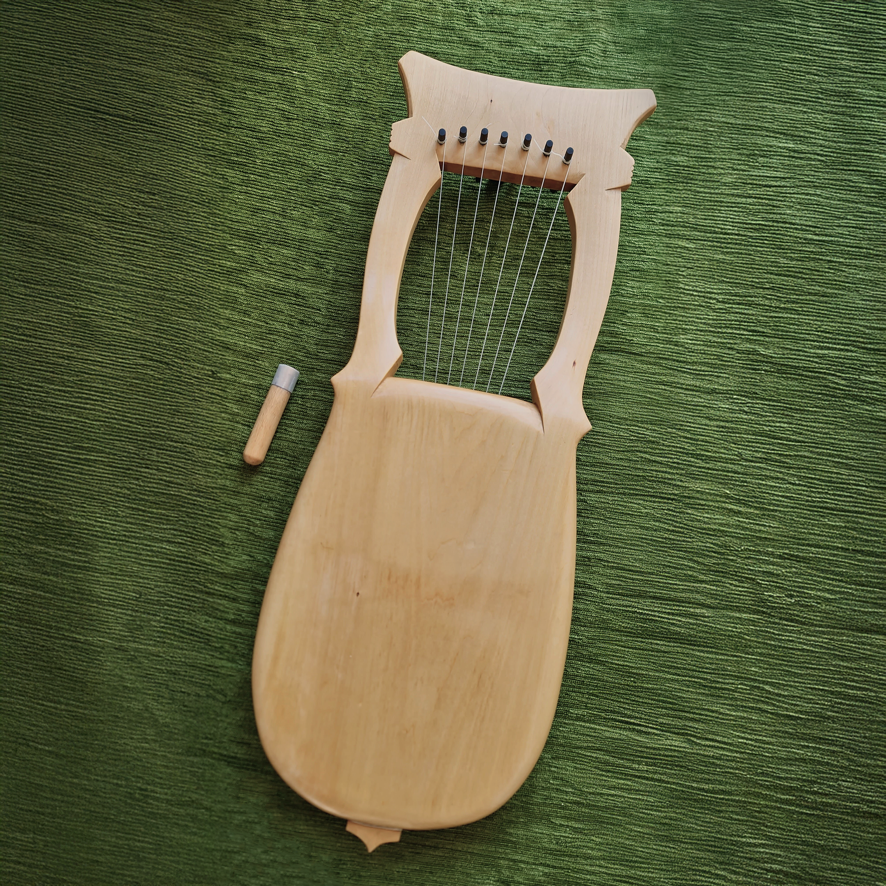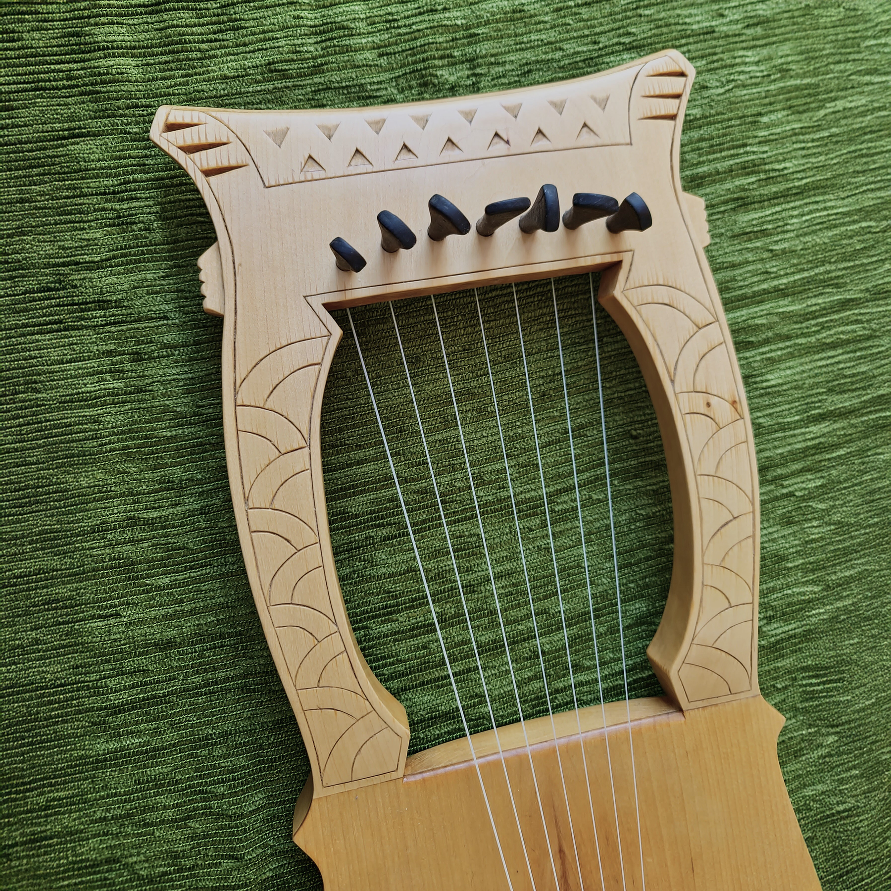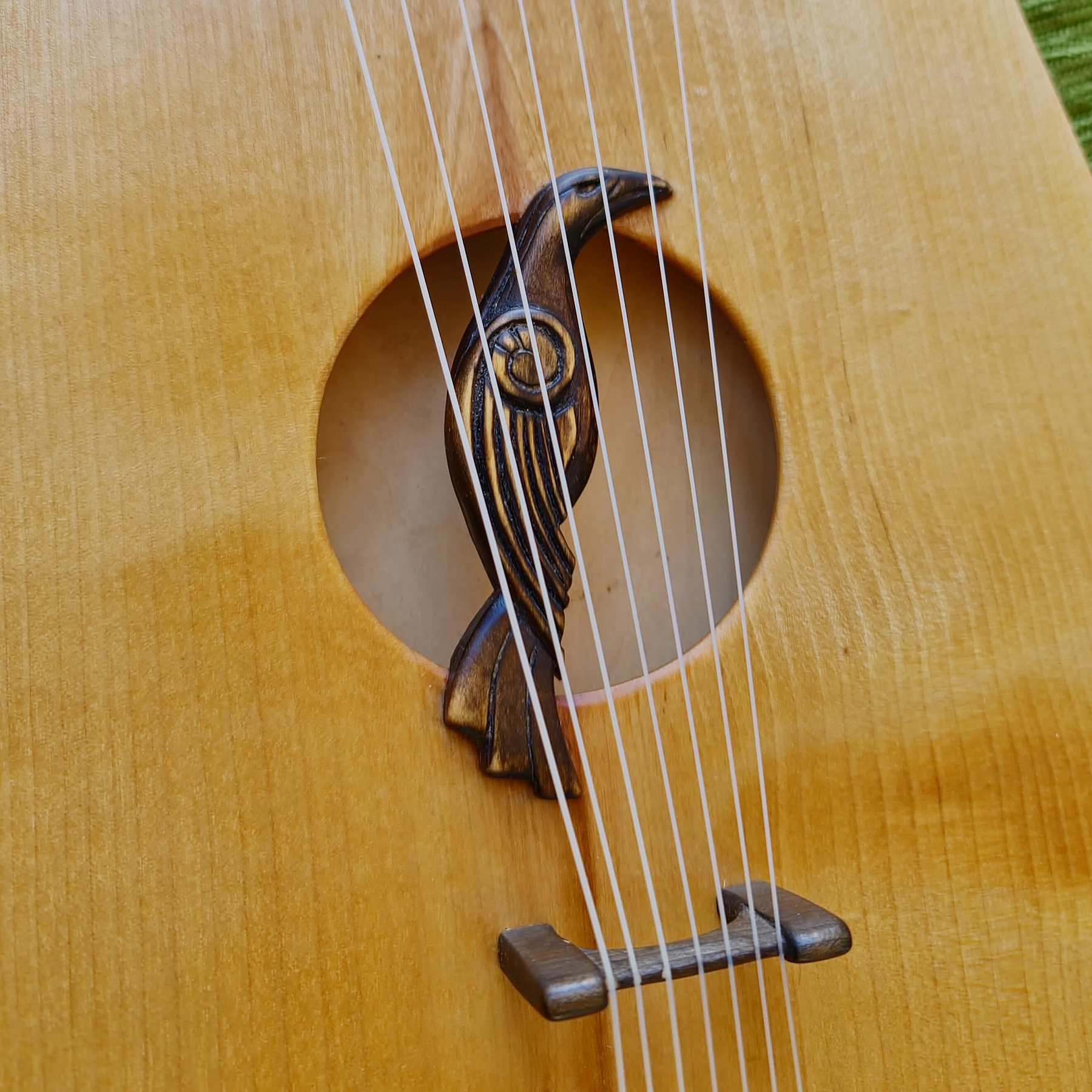 Eine sorgfältig gefertigte Nachbildung einer Kravik-Leier aus dem 16. Jahrhundert aus Lindenholz, gestimmt auf A–C–D–E–F–G–A. Das Instrument ist mit einer von Hand aufgetragenen Schellackpolitur versehen, die ihm einen warmen, natürlichen Glanz verleiht. Es verfügt über ein markantes Rabenmotiv, das in ein Klangfenster im nordischen Stil eingraviert ist und Weisheit und Geheimnis symbolisiert. Alle Komponenten wurden sorgfältig ebonisiert, was den Kontrast verstärkt und der Lyra einen eleganten, zeitlosen Charakter verleiht, der den Geist der frühen skandinavischen Handwerkskunst widerspiegelt.