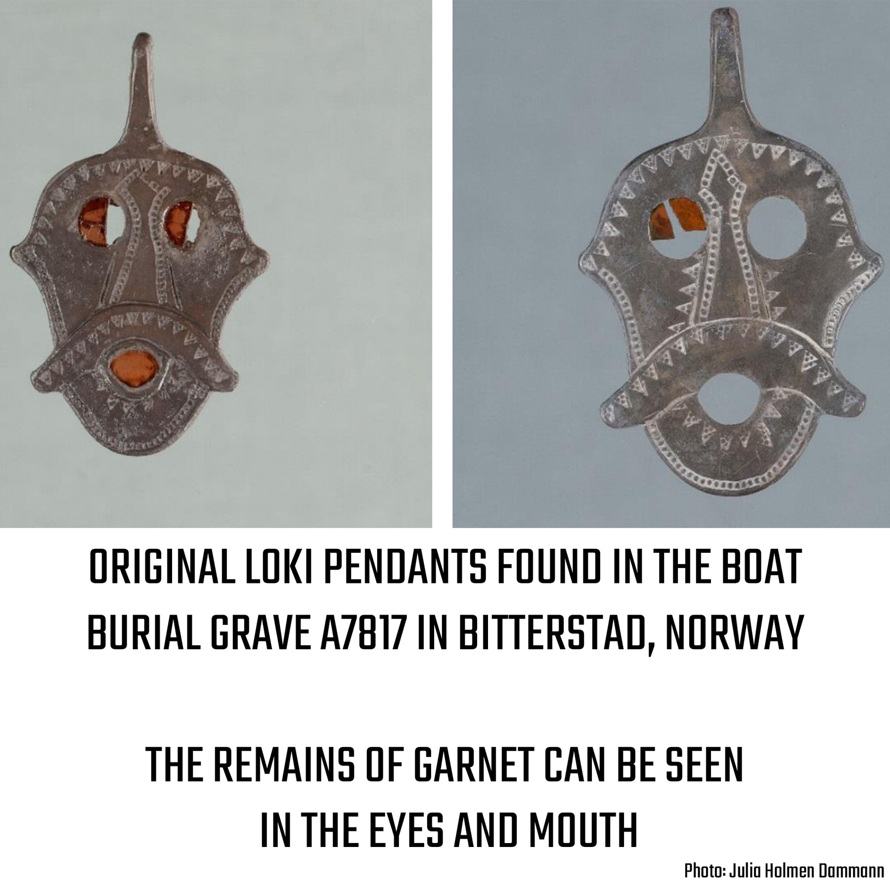Für die Anhänger, die Loki darstellen, sprechen vor allem zwei Fakten, die im archäologischen Bericht von Bitterstad aus dem Jahr 2016 ausführlich beschrieben werden. Zunächst einmal sind die Granate ein wichtiges Detail, da sie historisch gesehen mit Feuer in Verbindung gebracht werden. Loki wird oft mit Feuer in Verbindung gebracht, und es wird sogar behauptet, dass sein Name Feuer bedeutet, auch wenn dies etymologisch nicht bewiesen ist. Ein weiteres interessantes Detail ist der Herdstein aus Snaptun in Jütland, auf dem Loki dargestellt ist, nachdem ihm der Zwerg Brokk den Mund zugenäht hat. Der Herdstein wurde bei der Schmiedearbeit verwendet, was wiederum beweist, dass Feuer und Loki eng miteinander verbunden sind. Die Verbindung zwischen Schmieden und ihrer Verbindung zu Magie und Tod ist in letzter Zeit in der Literatur häufig thematisiert worden (z. B. Jørgensen 2015; Østigård 2007), und es scheint, dass Loki ein viel stärker verehrter Gott gewesen sein könnte als allgemein angenommen - ein Gott der Schmiede, der Magie, des Feuers und des Todes. Und nicht zuletzt ist das Bild auf dem Stein dem Schmuck von Bitterstad sehr ähnlich. Beide Figuren haben einen mächtigen Schnurrbart, runde Augen, eine scharf gezeichnete Nase und stilisiertes Haar.