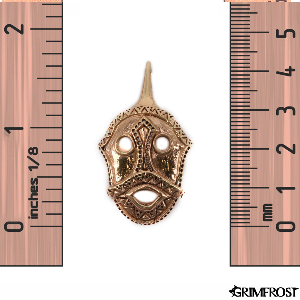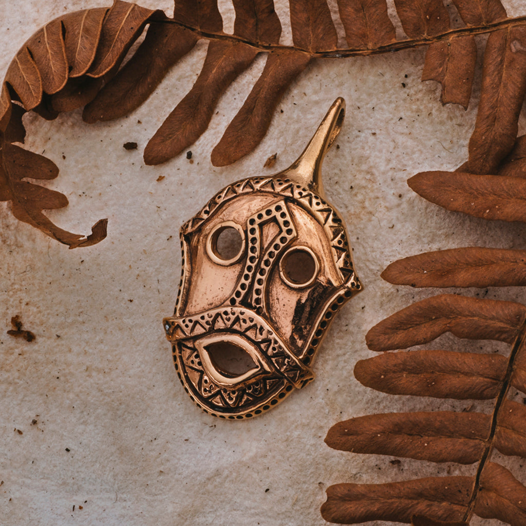 Dies ist eine Bronze-Reproduktion des sensationellen Anhängers, der 2013 im Bootsgrab A7817 in Bitterstad, Norwegen, gefunden wurde. Das Original war aus Silber mit Granaten in den Augen und im Mund - wir haben die exakte Kopie davon hier: Loki Amulett, Silber.