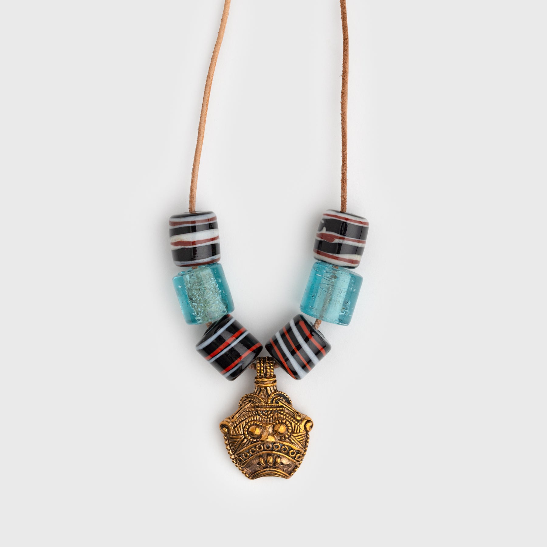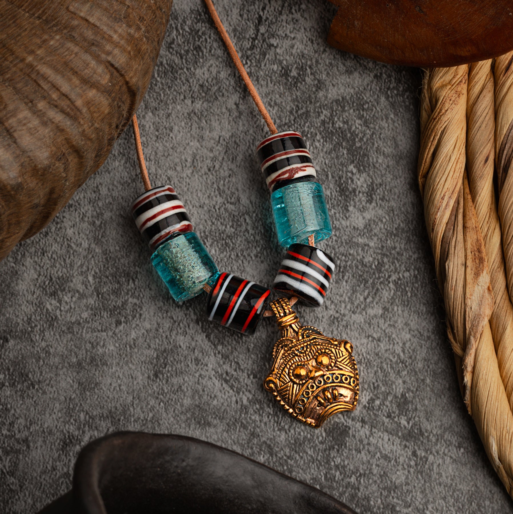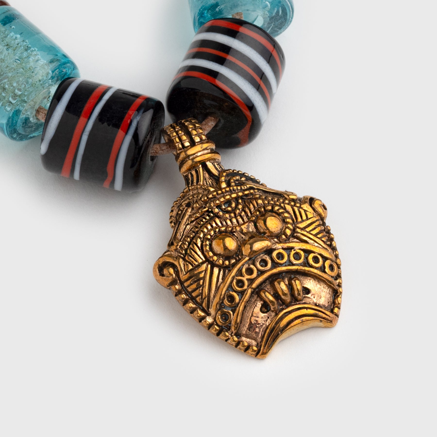 Reproduktion des außergewöhnlichen Loki-Amulettfundes aus dem Jahr 2015 in Vejen, Dänemark, als gebrauchsfertige Halskette mit Wikinger-Glasperlen. Es wird angenommen, dass es Loki mit zugenähtem Mund darstellt, wie es in der nordischen Mythologie beschrieben wird. Der Originalfund befindet sich heute im Dänischen Nationalmuseum. Das Amulett ist handgefertigt aus massiver Bronze.