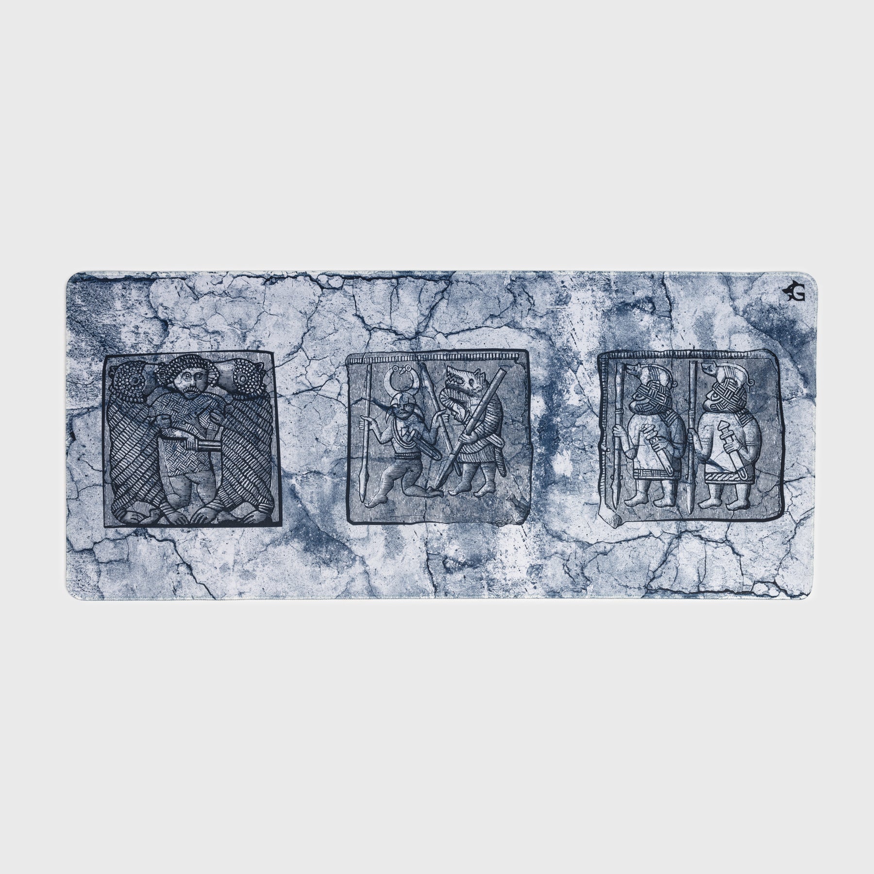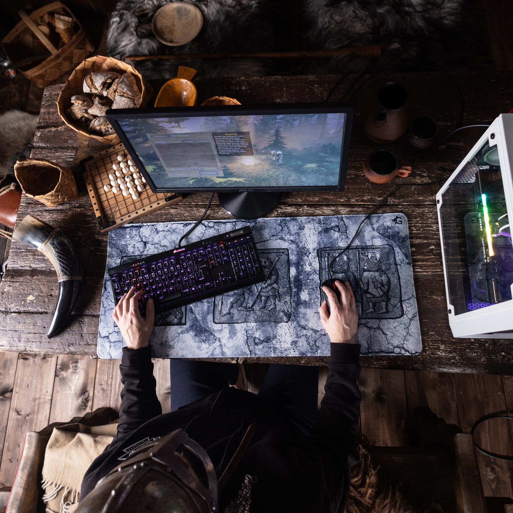 Ein Mauspad in absoluter Spitzenqualität, das die Wikinger auf deinen Schreibtisch bringt. Das Design ist den Torslunda-Platten entnommen, gegossenen Bronzestempeln, die in der Gemeinde Torslunda auf der schwedischen Insel Öland gefunden wurden. Sie stammen aus dem 6. bis 8. Jahrhundert und zeigen traditionelle mythologische Szenen.