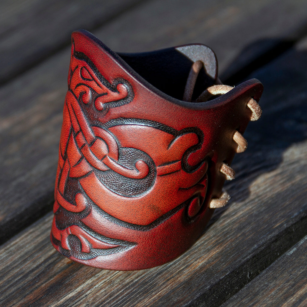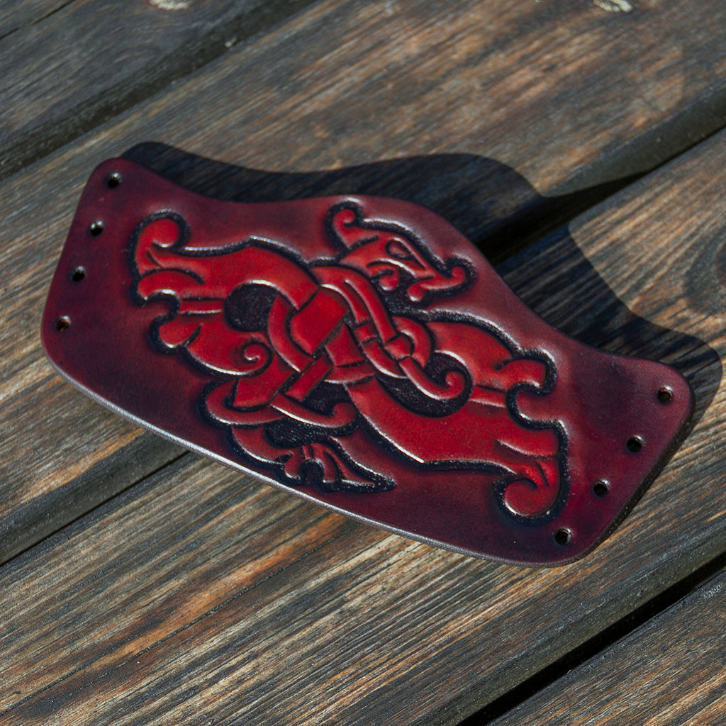 Die zeitaufwändige Herstellung unserer Premium Armschienen erfordert eine Kombination aus hoher Kunstfertigkeit und handwerklichem Geschick. Jedes individuelle Motiv wird für den jeweiligen Zweck entworfen und von Hand auf das Leder aufgetragen, das von traditionellen schwedischen Gerbern stammt. Unsere Premium Armschienen sind wahre Kunstwerke, die der Authentizität und Qualität der Wikinger treu bleiben.