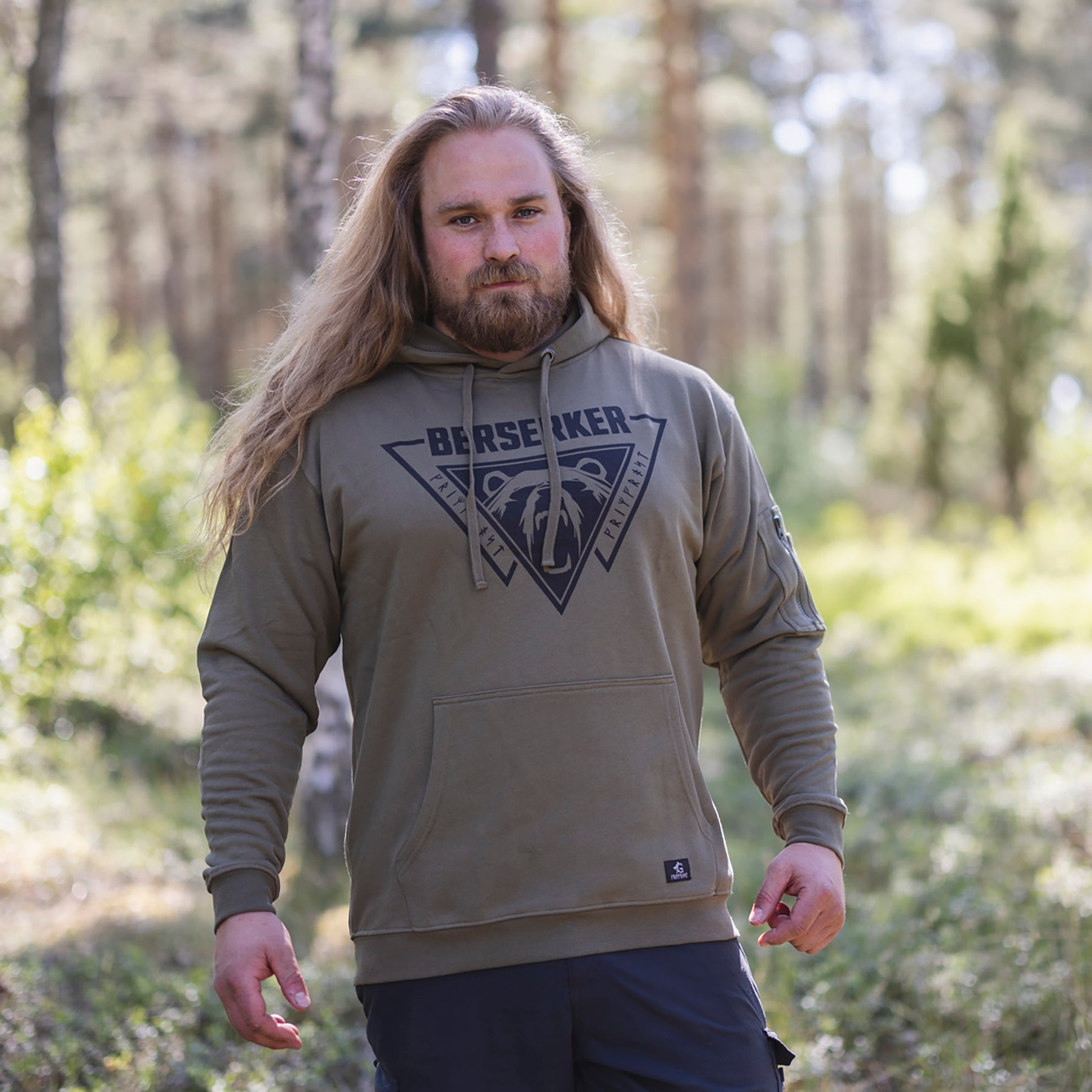 Der Berserker war ein Wikingerkrieger, der in der Lage war, im Kampf in einen Zustand überwältigender Wut zu verfallen, der oft mit dem eines wilden Tieres, z. B. eines Bären, verglichen wurde (Berserker bedeutet aus dem Altnordischen tatsächlich Bärenhemd). Dies verlieh ihm übermenschliche Kraft und die Fähigkeit, Schmerz und Schaden zu ignorieren. Die Wirkung war so groß, dass der Begriff "Berserker" auch heute noch verwendet wird. Wir erwarten nicht, dass Sie in diesem Hoodie Berserker werden - aber wir erwarten, dass Sie gut aussehen.