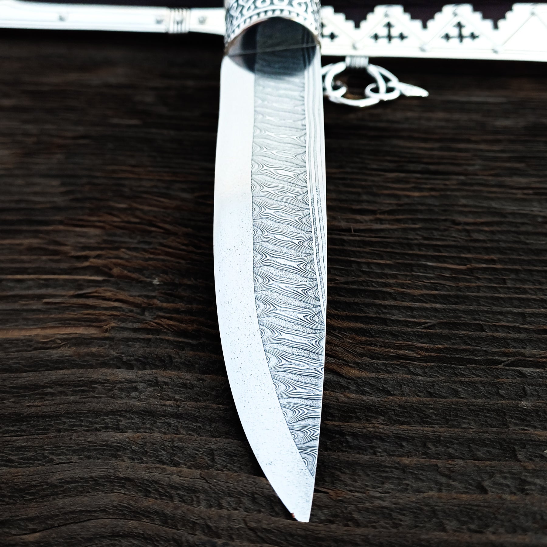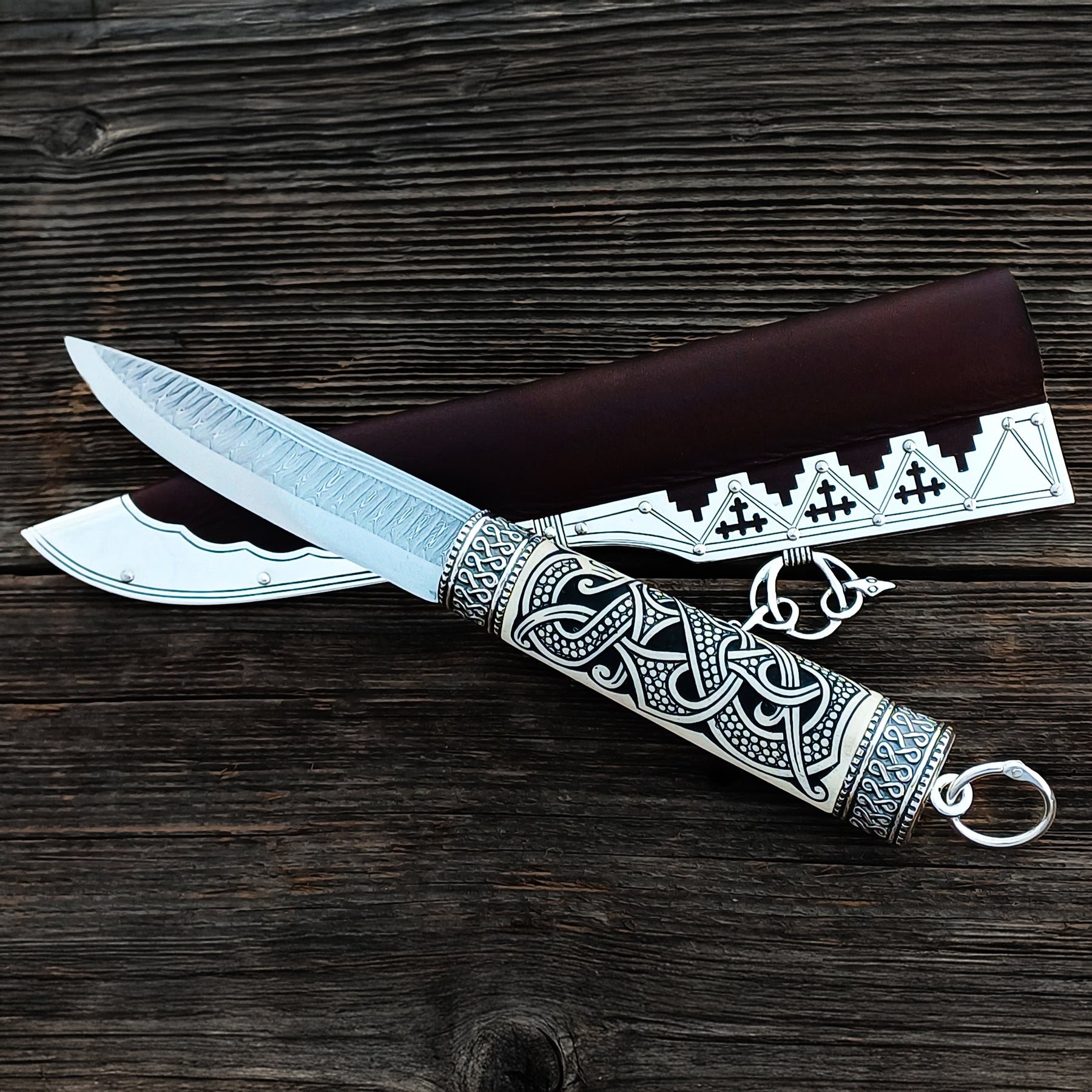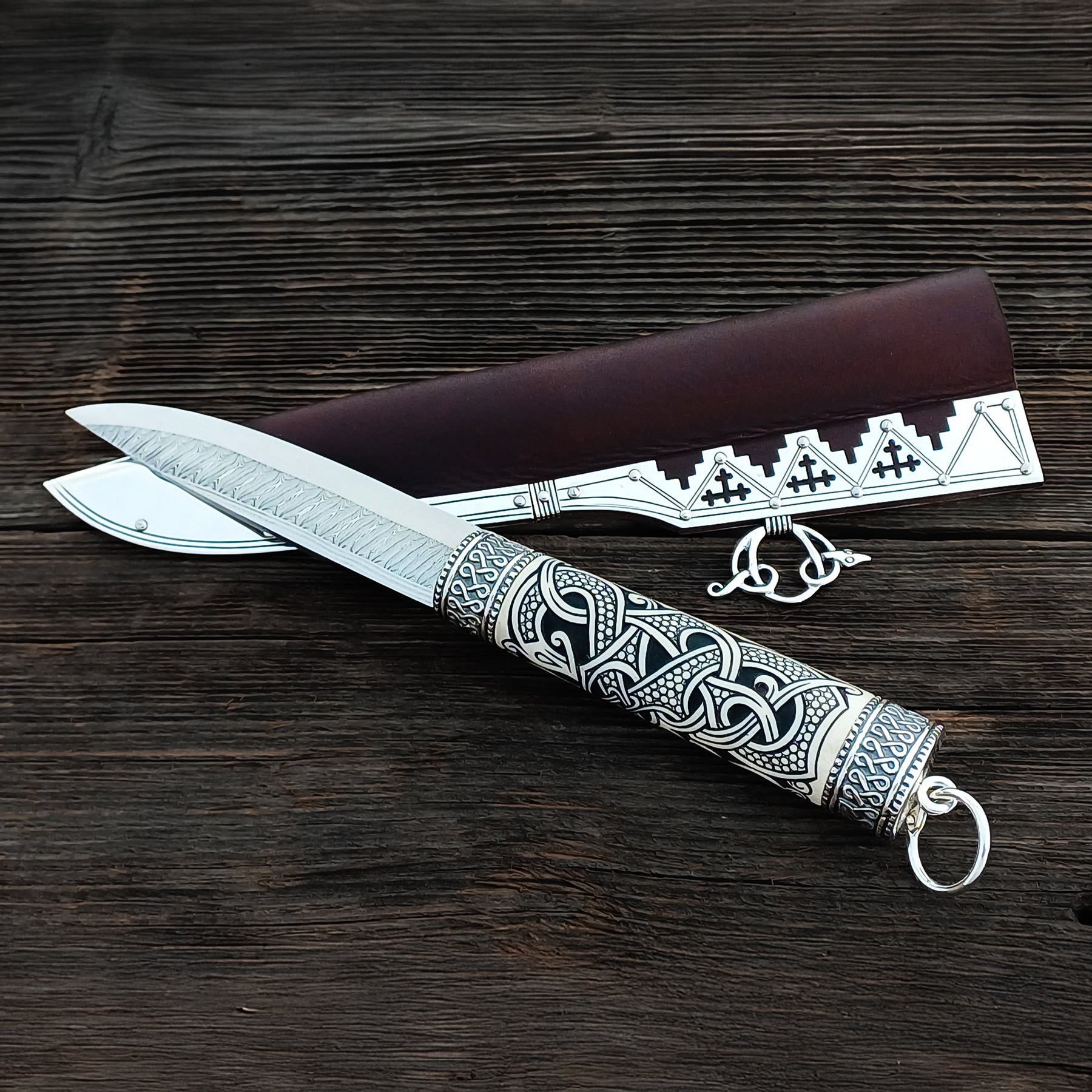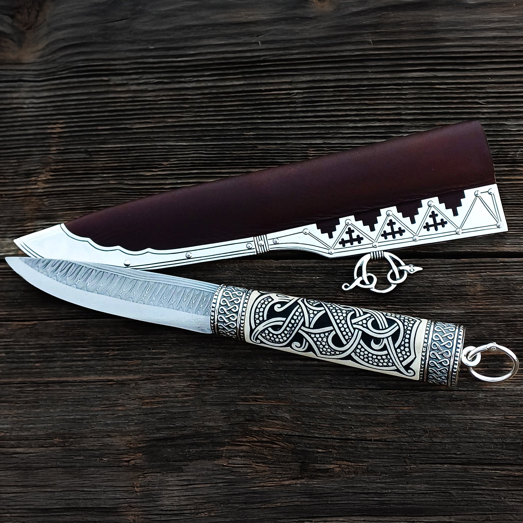 Dieses exklusive Wikingermesser hat eine beeindruckende gemusterte (Damast-)Klinge und einen Griff aus Geweih und Silber. Die Lederscheide ist mit Silberbeschlägen versehen. Handgefertigt mit viel Liebe zum Detail.