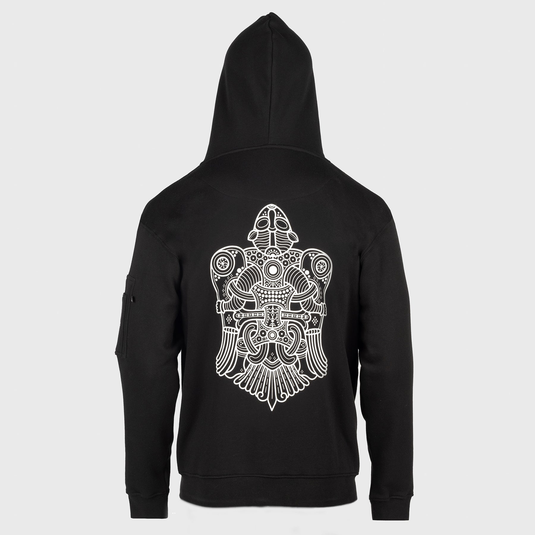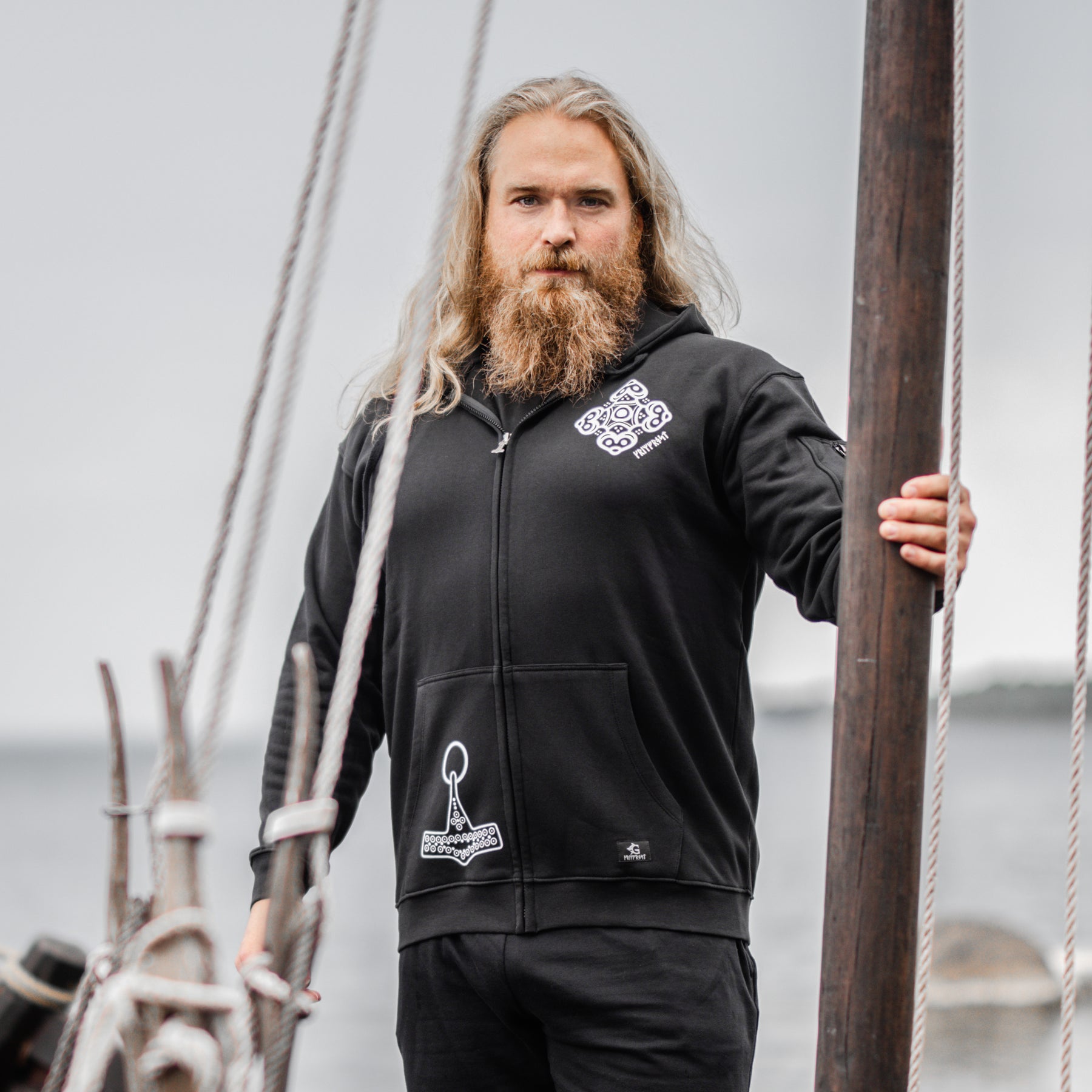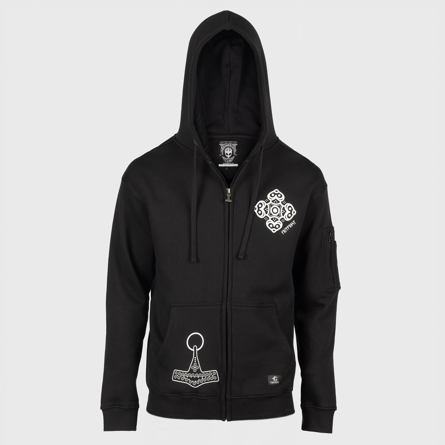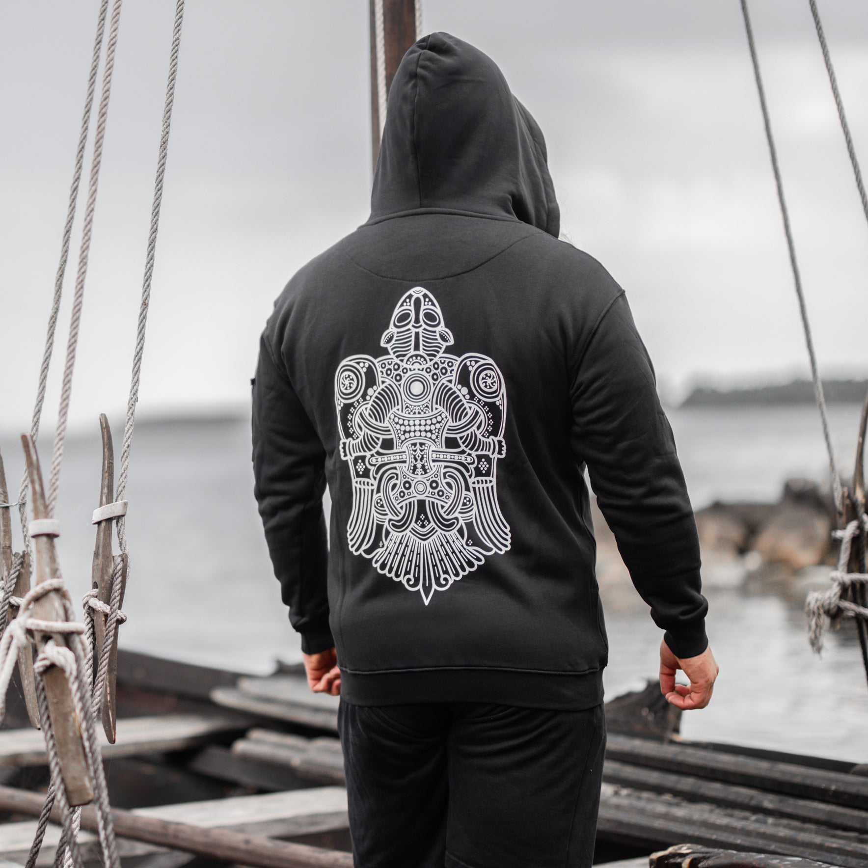 Dieser Premium Kapuzenpullover mit Reißverschluss wurde speziell für Grimfrost aus weicher, luxuriöser Bio-Baumwolle hergestellt. Sogar die Färbe- und Druckverfahren sind komplett biologisch, was sowohl für Sie als auch für Mutter Erde gut ist. Der Hoodie kommt mit geräumigen Kängurutaschen. Zusätzlich haben wir den Reißverschluss mit einem Thorshammer-Schiebergriff und die Ösen des Kordelzugs mit einem Runenkreis des Jüngeren Futhark versehen.