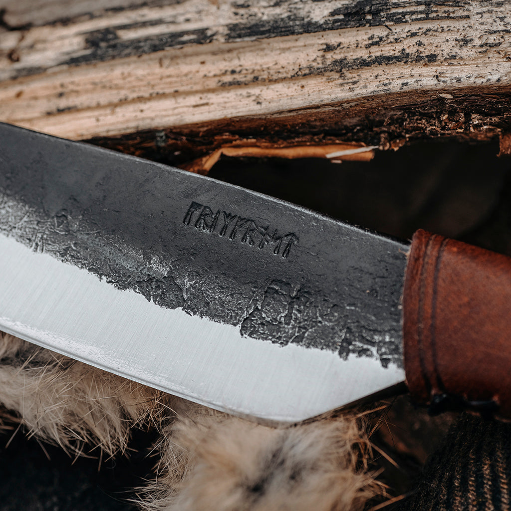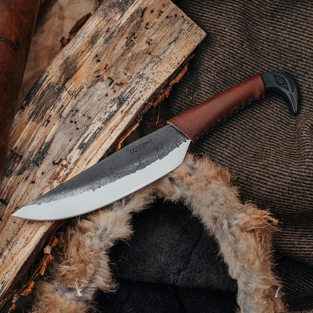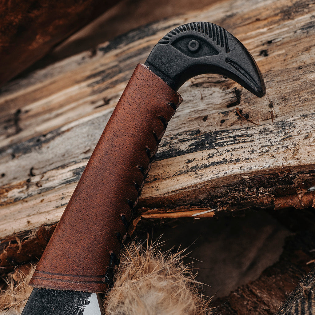 Allzweck-Wikinger-Messer aus geschmiedetem Stahl. Die Klinge ist geschliffen und der Knauf ist ein sorgfältig gearbeiteter Rabenkopf. Der Griff ist mit genähtem Leder überzogen. Die Scheide ist aus robustem Leder gefertigt, das das Messer an seinem Platz hält.