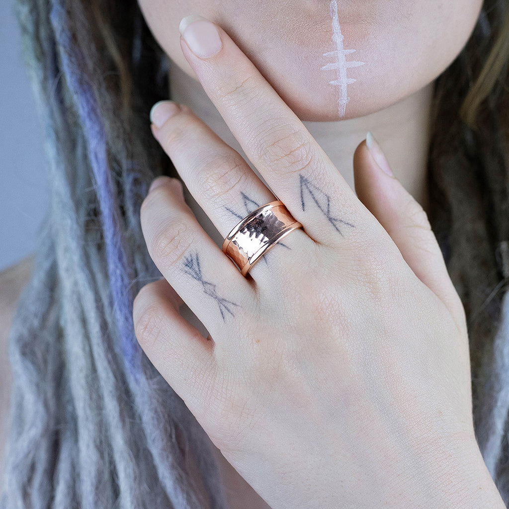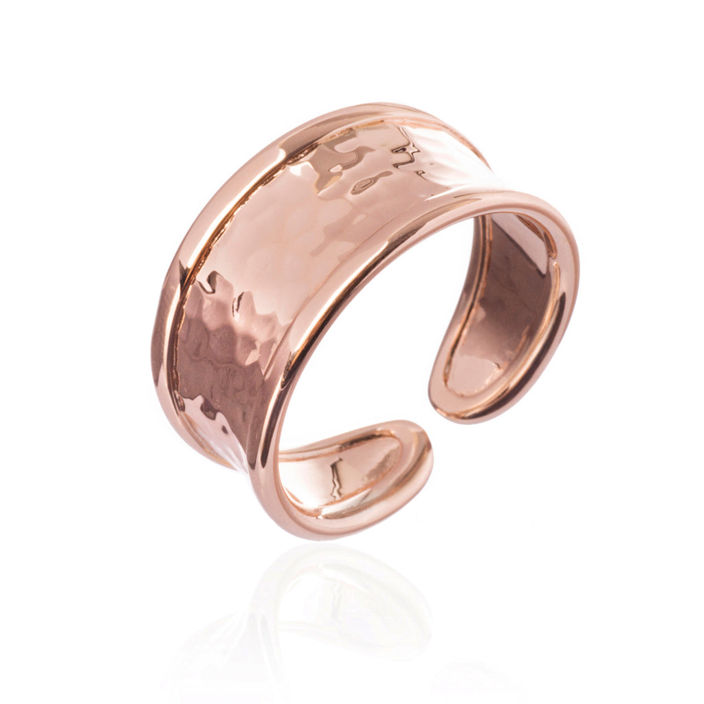 Ein breiter, offener Ring mit einer schönen, gehämmerten Oberfläche und einer abgerundeten Kante. Fachmännisch handgefertigt aus massivem 925er Sterlingsilber mit einer 18 Karat Rosévergoldung, wird er garantiert gefallen.