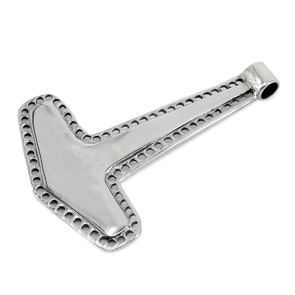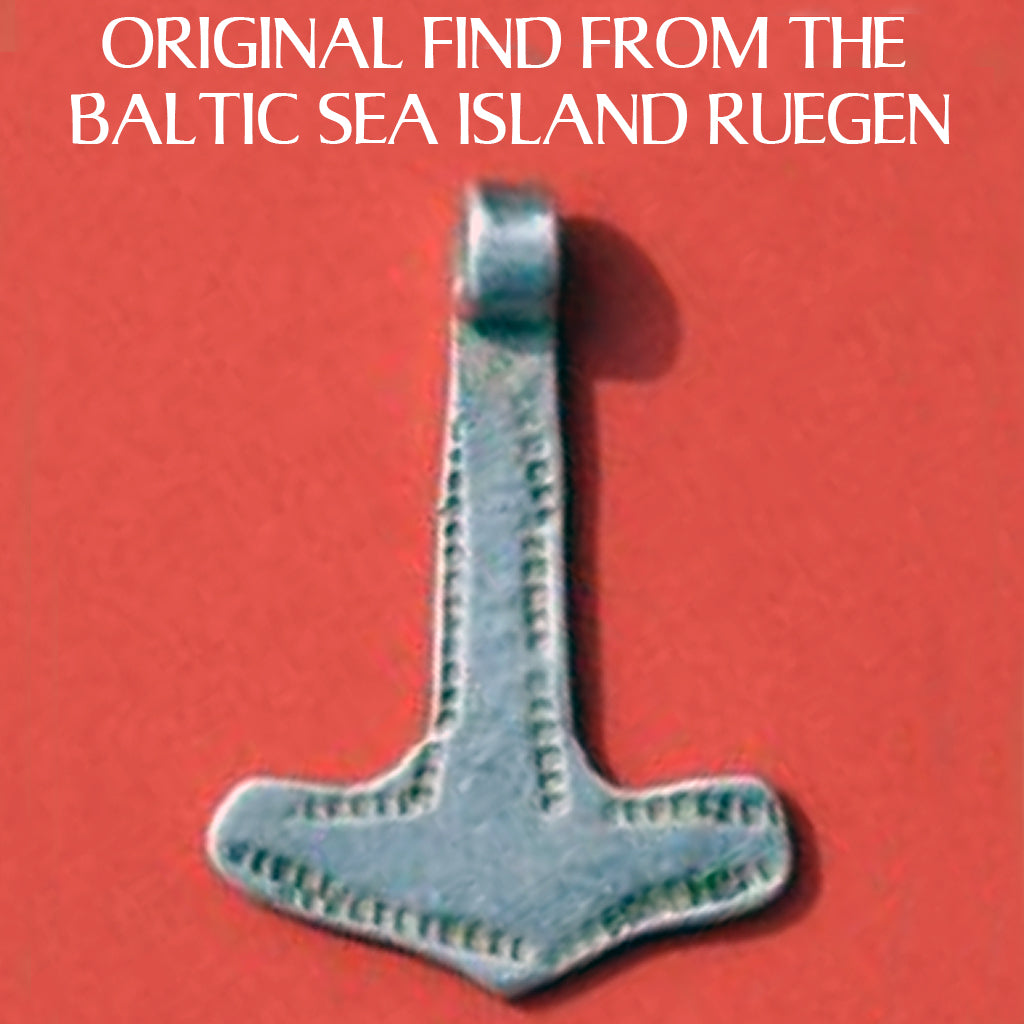 Thorshammer aus massivem Sterlingsilber. Er ist eine Nachbildung des Anhängers aus dem unglaublichen Silberschatz, der 2018 auf der Ostseeinsel Rügen entdeckt wurde. Der Hammer wurde zwischen Hunderten von Silbermünzen, Ringen, Perlen und Armbändern gefunden.