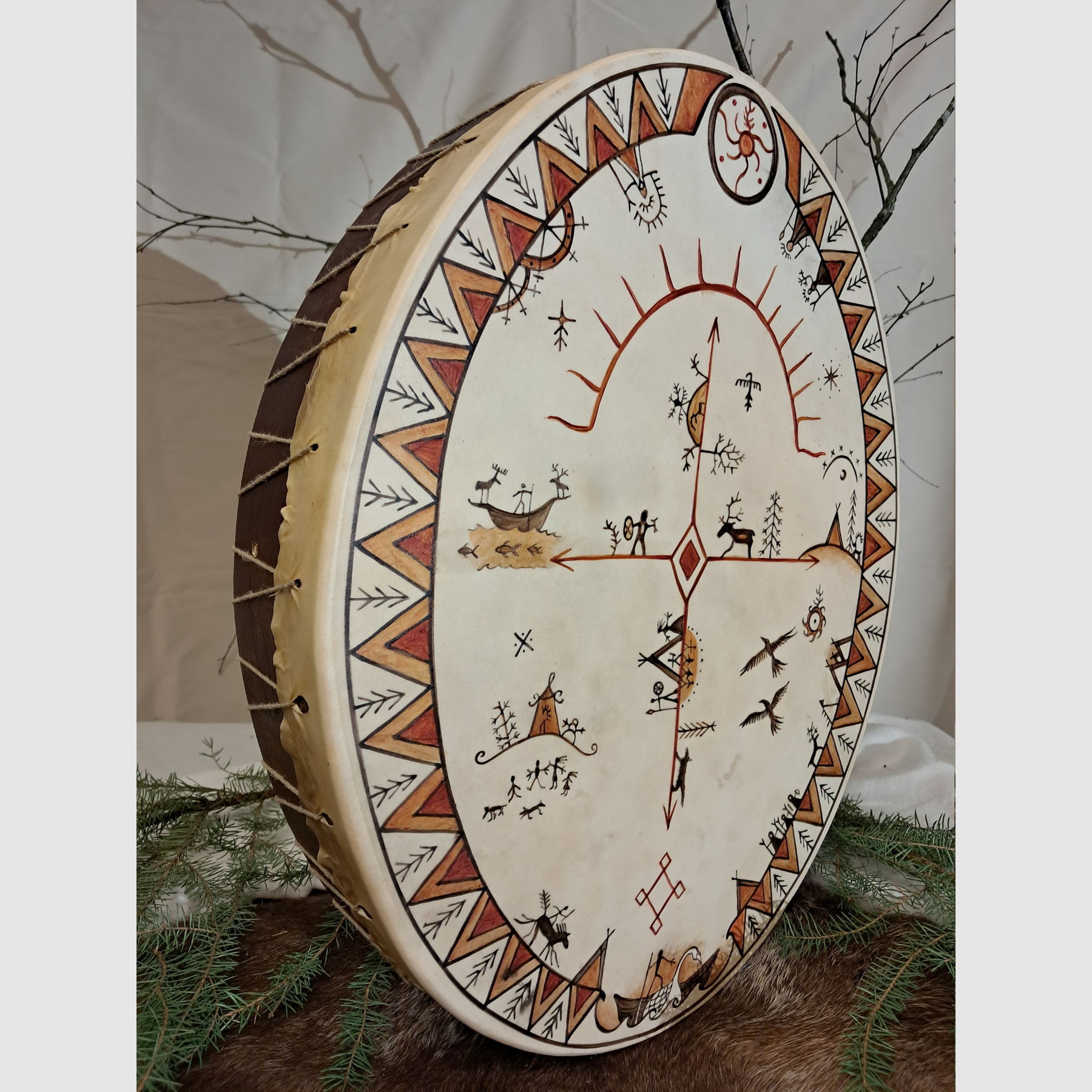 Päivö, das samische Sonnensymbol, ist wunderschön von Hand auf das Trommelfell gemalt und von verschiedenen Wesen der Welt umgeben. Die Kunst ist vom samischen Volk in Skandinavien inspiriert.