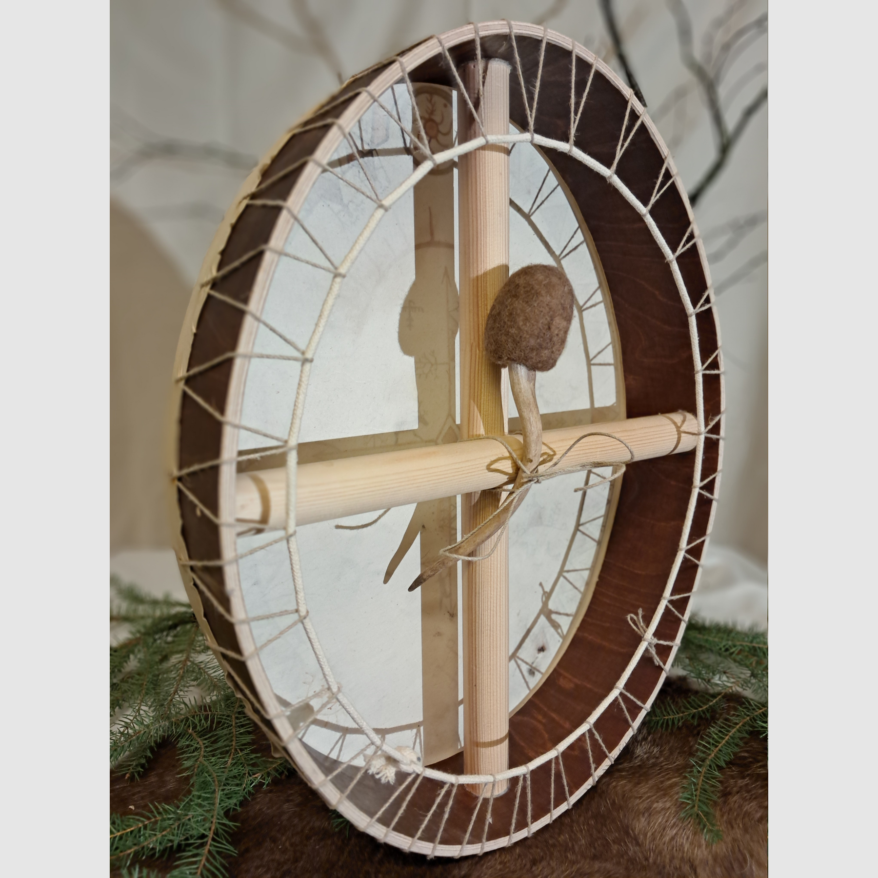 Traditionelle Schamanentrommel, die in sorgfältiger Handarbeit in Finnland hergestellt wird, wo alte nordische schamanische Traditionen über Jahrhunderte hinweg überlebt haben. Sie wurde aus traditionellen Materialien ohne den Einsatz von Werkzeugen hergestellt. Lediglich eine Handsäge, ein Messer und Schmirgelpapier wurden während des Prozesses verwendet. Diese Herstellungsmethode braucht Zeit, aber sie ist notwendig, wenn die Trommel einen eigenen Geist haben soll.