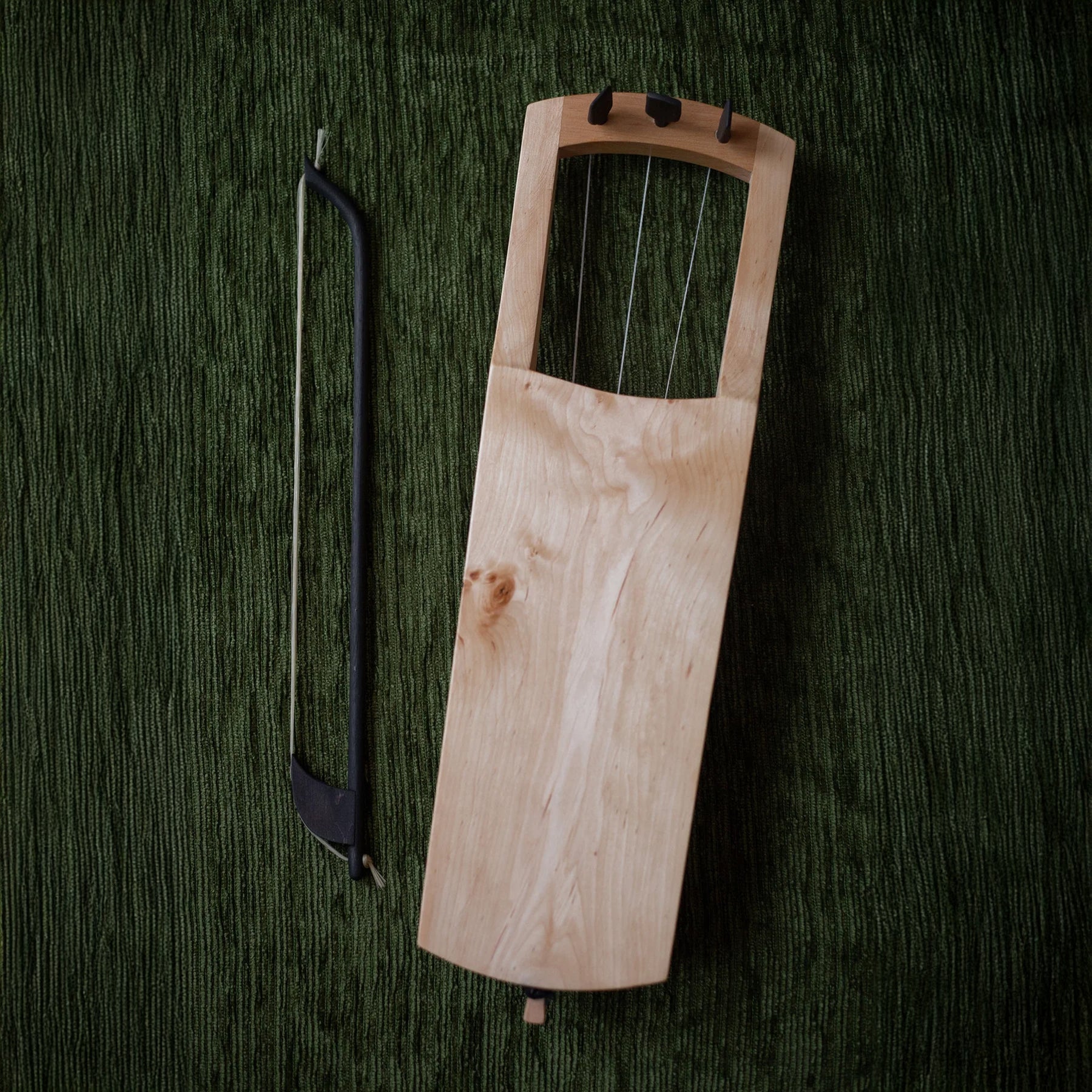 Diese dreisaitige Tagelharpa wurde nach modernen Kriterien gefertigt, aus einem einzigen Stück Holz geschnitzt und mit einem separaten Wirbelkasten versehen, der auf beiden Seiten mit Holzdübeln verstärkt ist, um die Haltbarkeit zu erhöhen. Der Korpus des Instruments verjüngt sich anmutig nach unten, was sowohl der Ästhetik als auch der Spielbarkeit zugute kommt. Das Holz ist sorgfältig geschliffen und mit einer feinen Schellackpolitur versehen, die ihm eine glatte, elegante Oberfläche verleiht.
