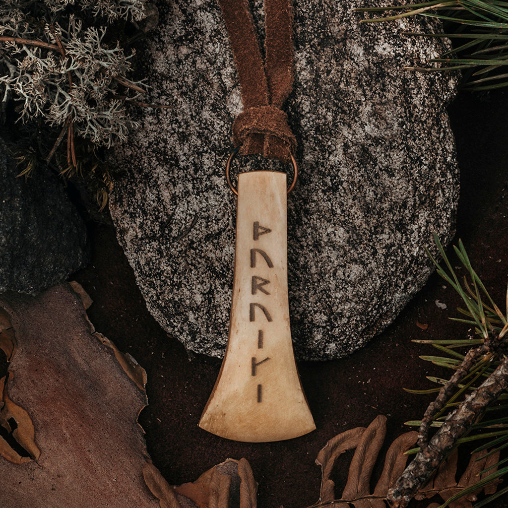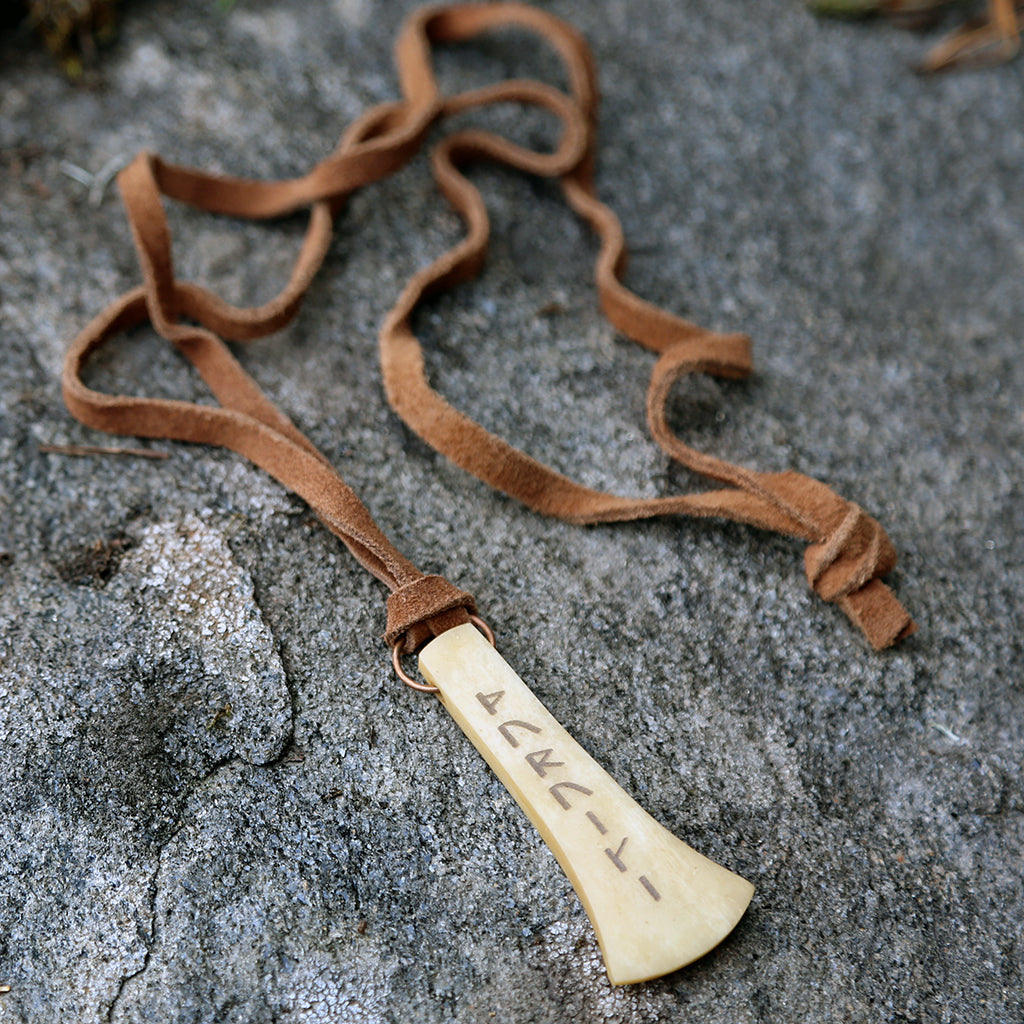 Handgefertigtes Knochenamulett mit "Thor Viki" in den Runen des Jüngeren Futhark geschrieben. Es wurde als Schutzformel verwendet und bedeutet aus dem Altnordischen übersetzt "Thor segne" oder "Thor beschütze".