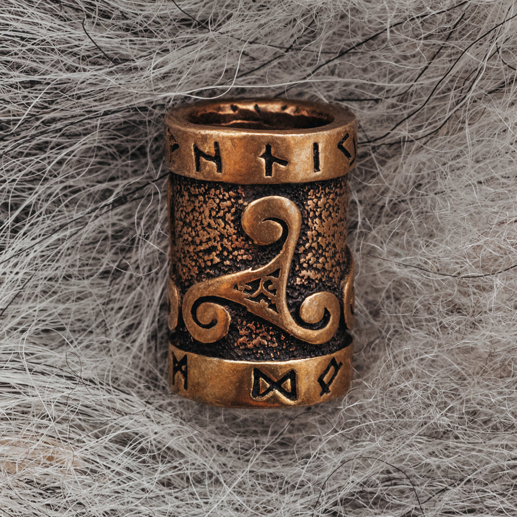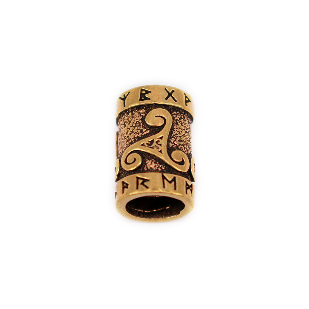 Eine große Perle aus Bronze mit einem Triskele-Muster und dem Runenalphabet des Älteren Futhark.