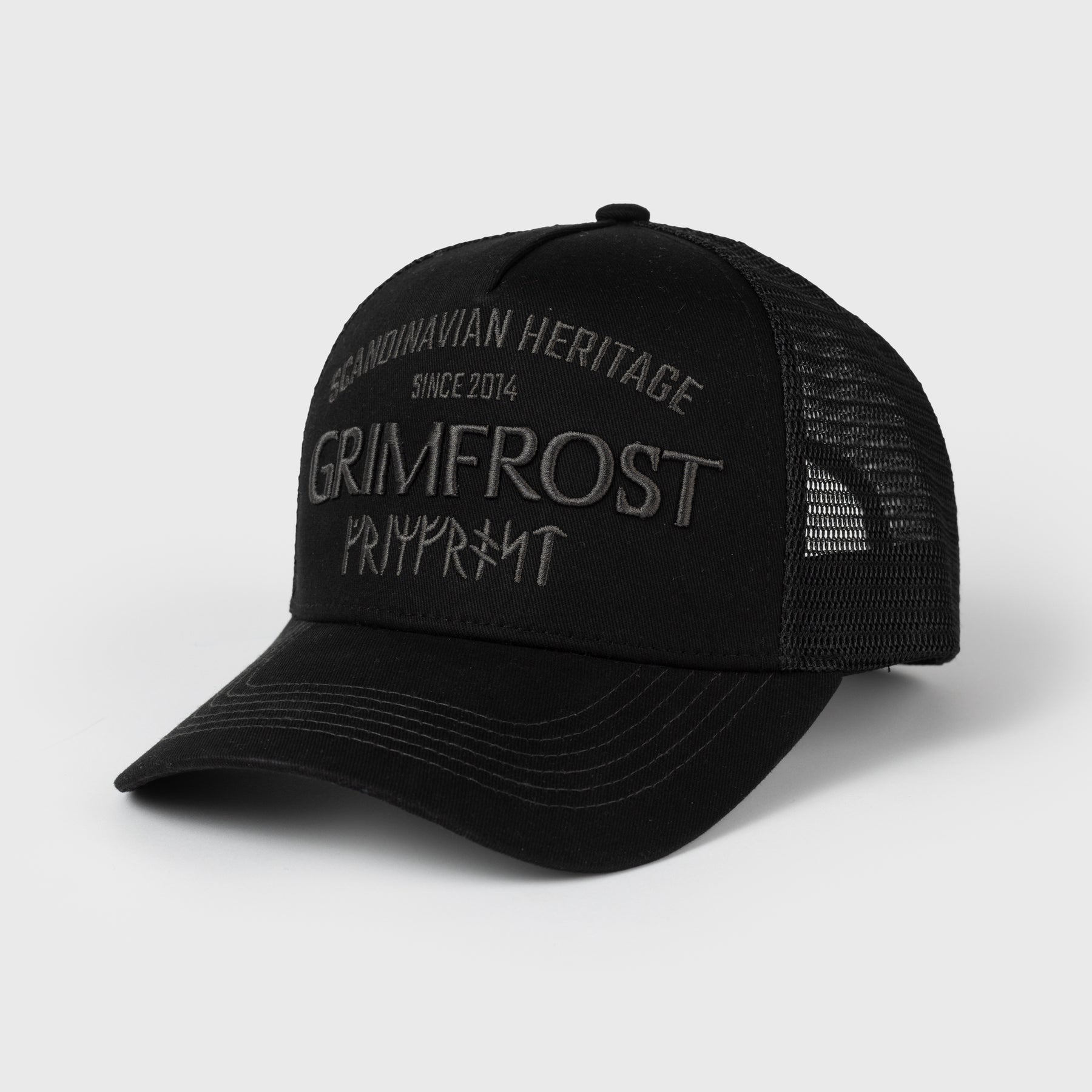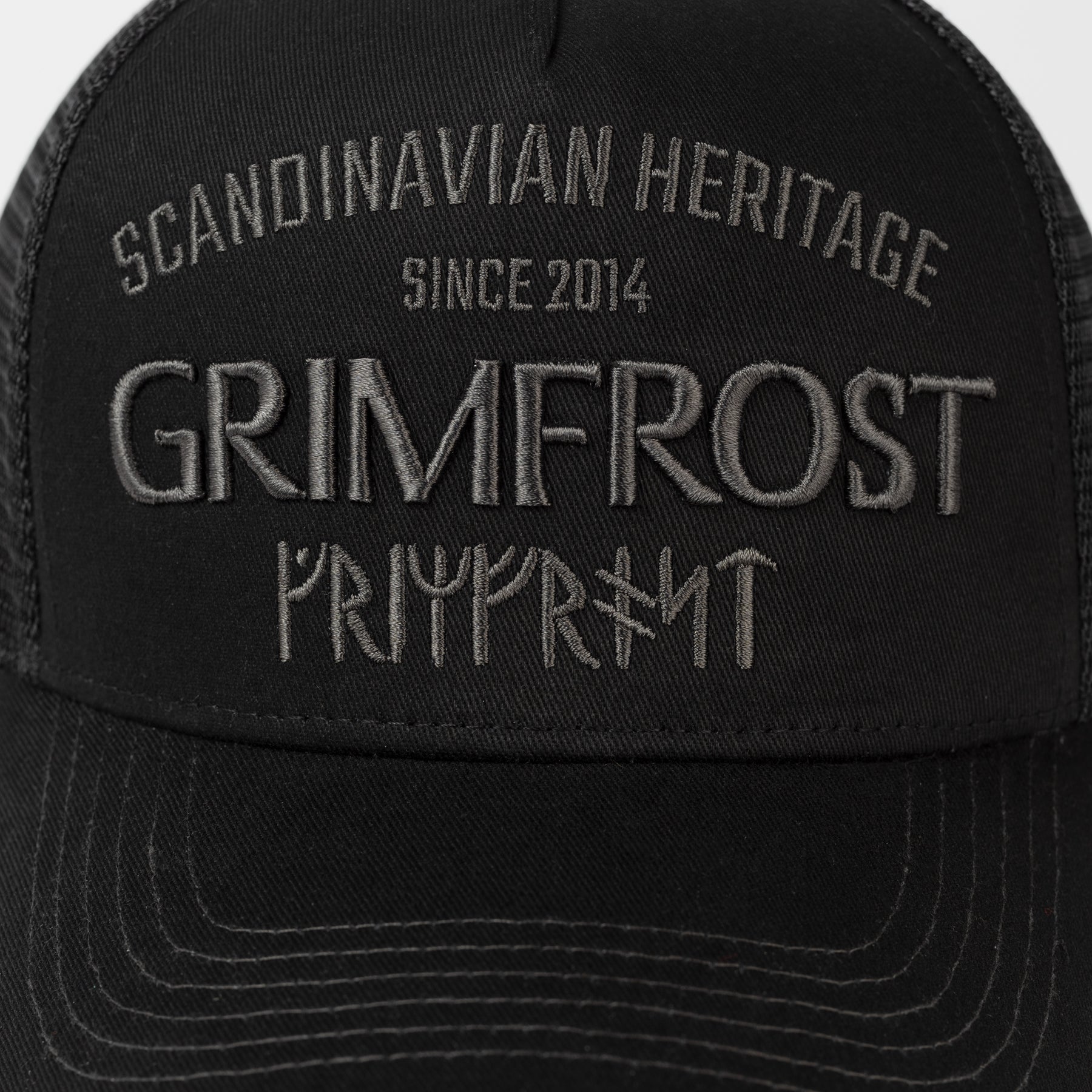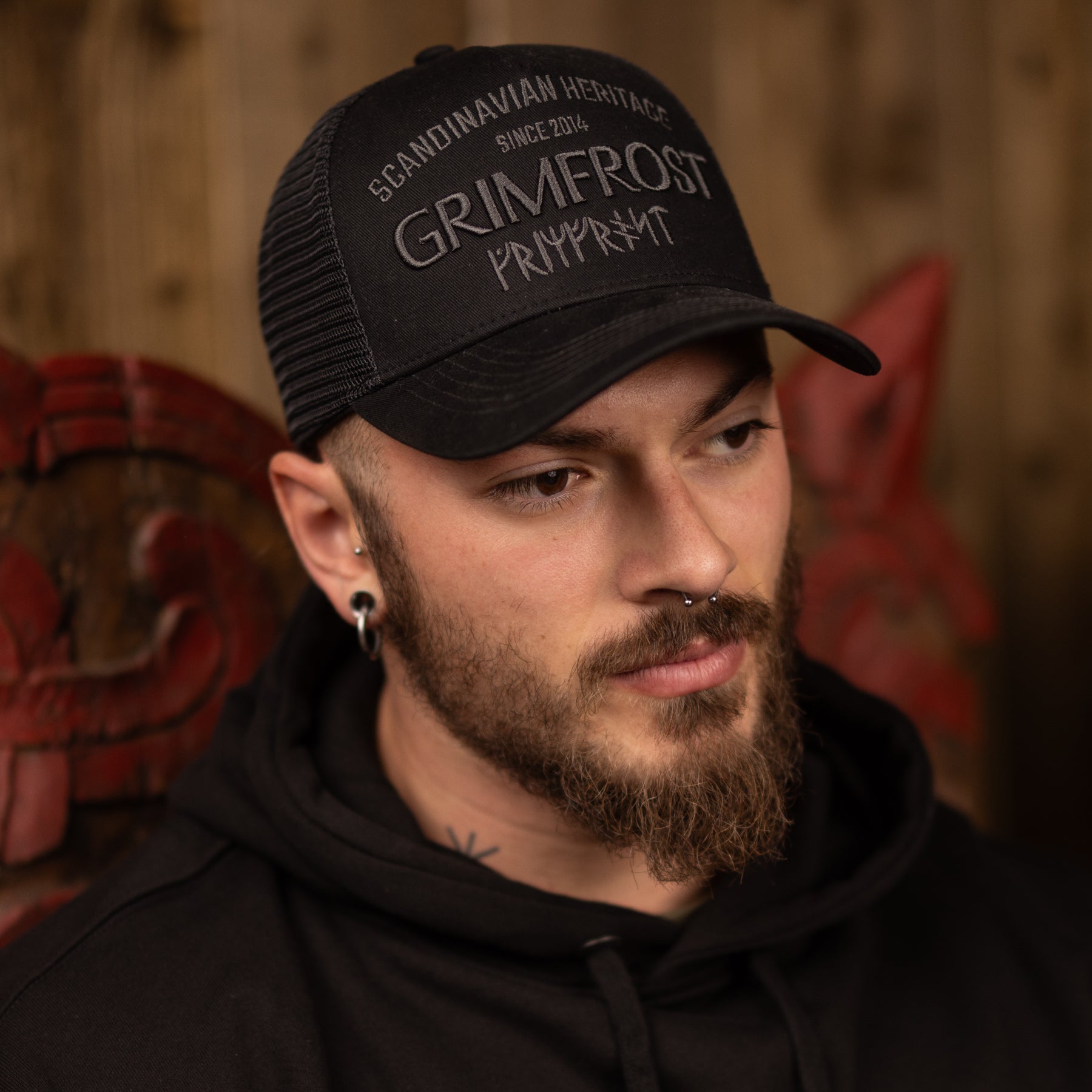 Hochwertiger strukturierter Trucker Cap mit Netzeinsätzen. Auf der Vorderseite ist "Grimfrost", ebenfalls in Runen, zusammen mit "Scandinavian Heritage since 2014" aufgestickt. Die Innenseite ist mit Tricot-Köpergewebe gefüttert, das für hervorragenden Komfort und Atmungsaktivität sorgt.