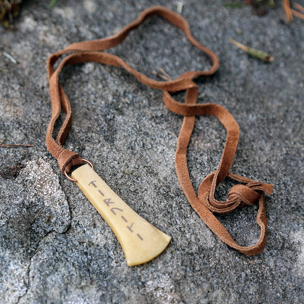 Handgefertigtes Knochenamulett mit "Tyr Viki", geschrieben in den Runen des Jüngeren Futhark. Es wurde als Schutzformel verwendet und bedeutet aus dem Altnordischen übersetzt "Tyr segne" oder "Tyr schütze".