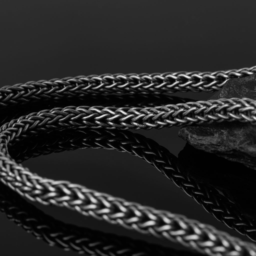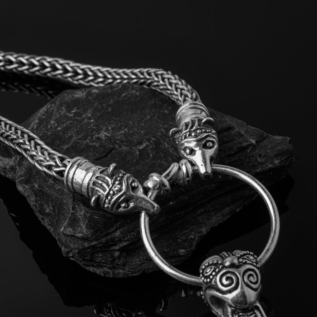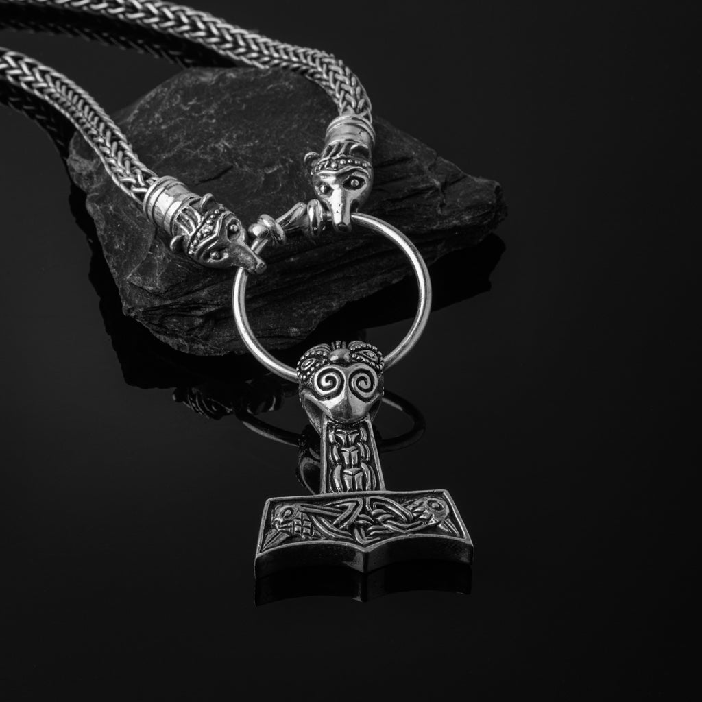 Die Wikinger verwendeten Halsketten mit Tieren oder Bestien, die auf einen Ring bissen, an dem Anhänger hingen. Diese Variante aus Sterlingsilber ist ein wahrhaft majestätisches Stück, das mit Bärenköpfen endet, die auf einem einzigartigen Fund in Eketorp, Schweden, aus dem Jahr 2017 basieren. Die Bären beißen auf einen Ring mit einem rabenköpfigen Thorshammer, wobei Huginn und Muninn im Hammerkopf dargestellt sind. Huginn und Muninn waren die beiden Raben des Gottes Odin.