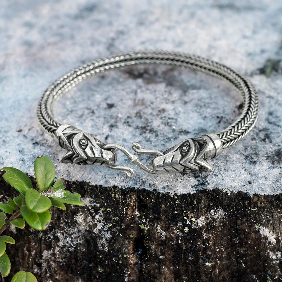 Die Wikinger verwendeten Halsketten mit Tieren oder Bestien, die auf einen Ring bissen, an dem Anhänger hingen. Diese Version, ein Armband aus Sterlingsilber, ist wirklich ein majestätisches Stück und endet in den Köpfen von Freki und Geri, die beiden Wölfe von Odin.