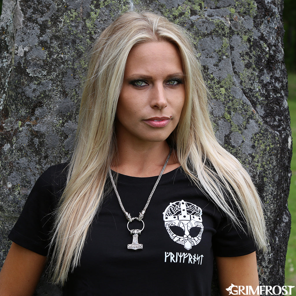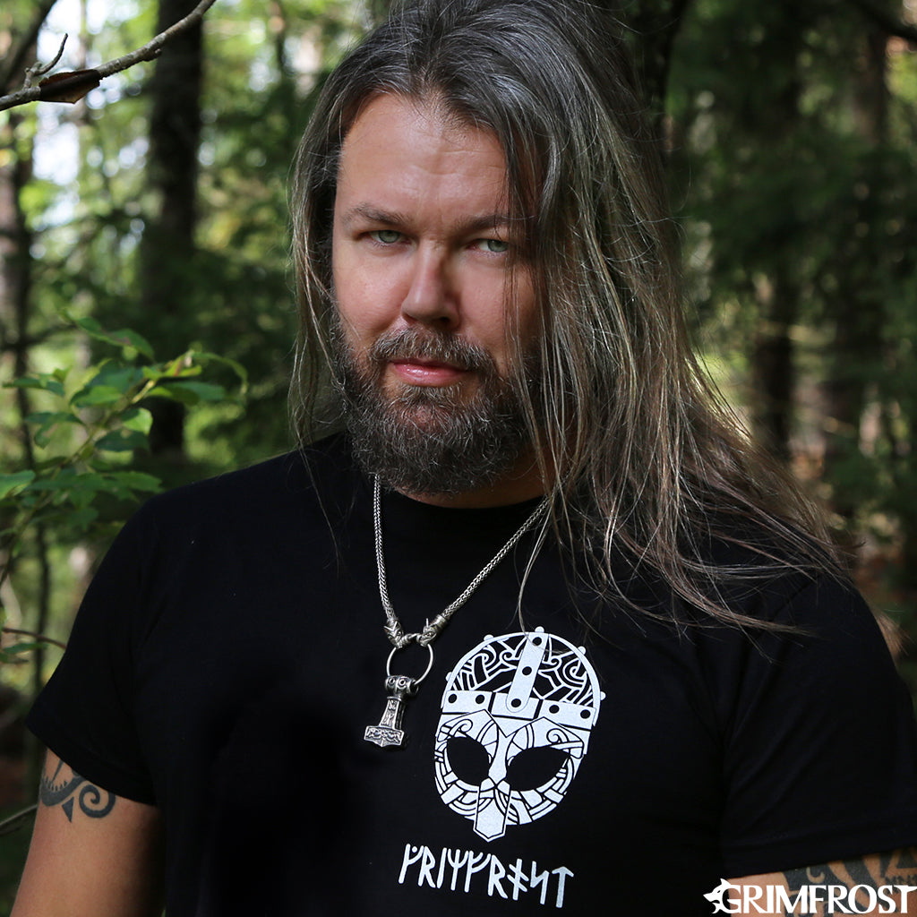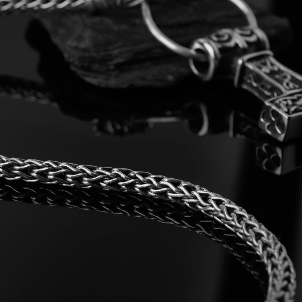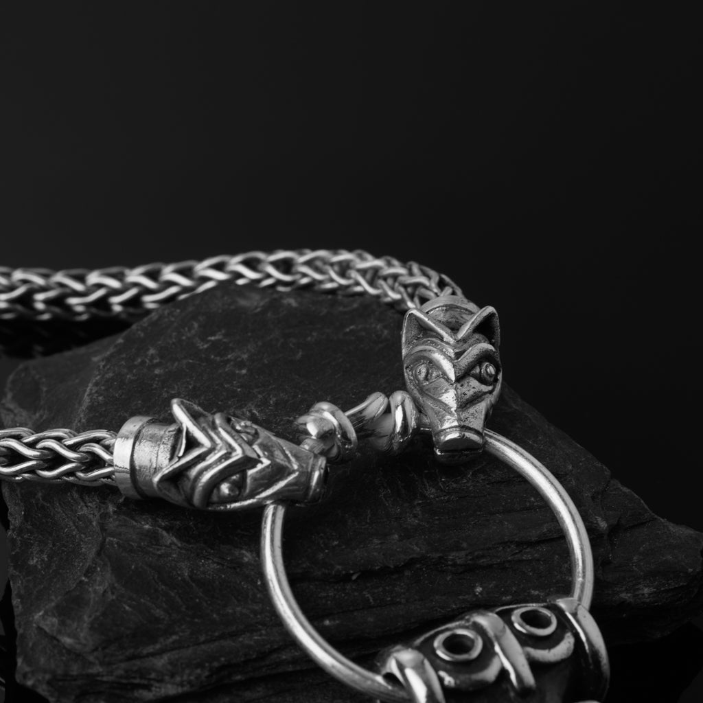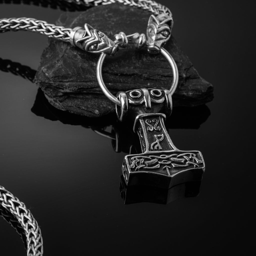 Die Wikinger verwendeten Halsketten mit Tieren oder Bestien, die auf einen Ring bissen, an dem Anhänger hingen. Diese Variante aus Sterlingsilber ist ein wahrhaft majestätisches Stück und endet in den Köpfen von Freki und Geri, die auf einen Anhängerring mit Grimfrosts Thorshammer, der auf einem archäologischen Fund aus Ödeshög, Schweden, basiert