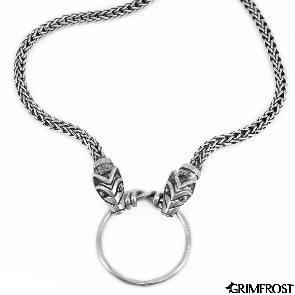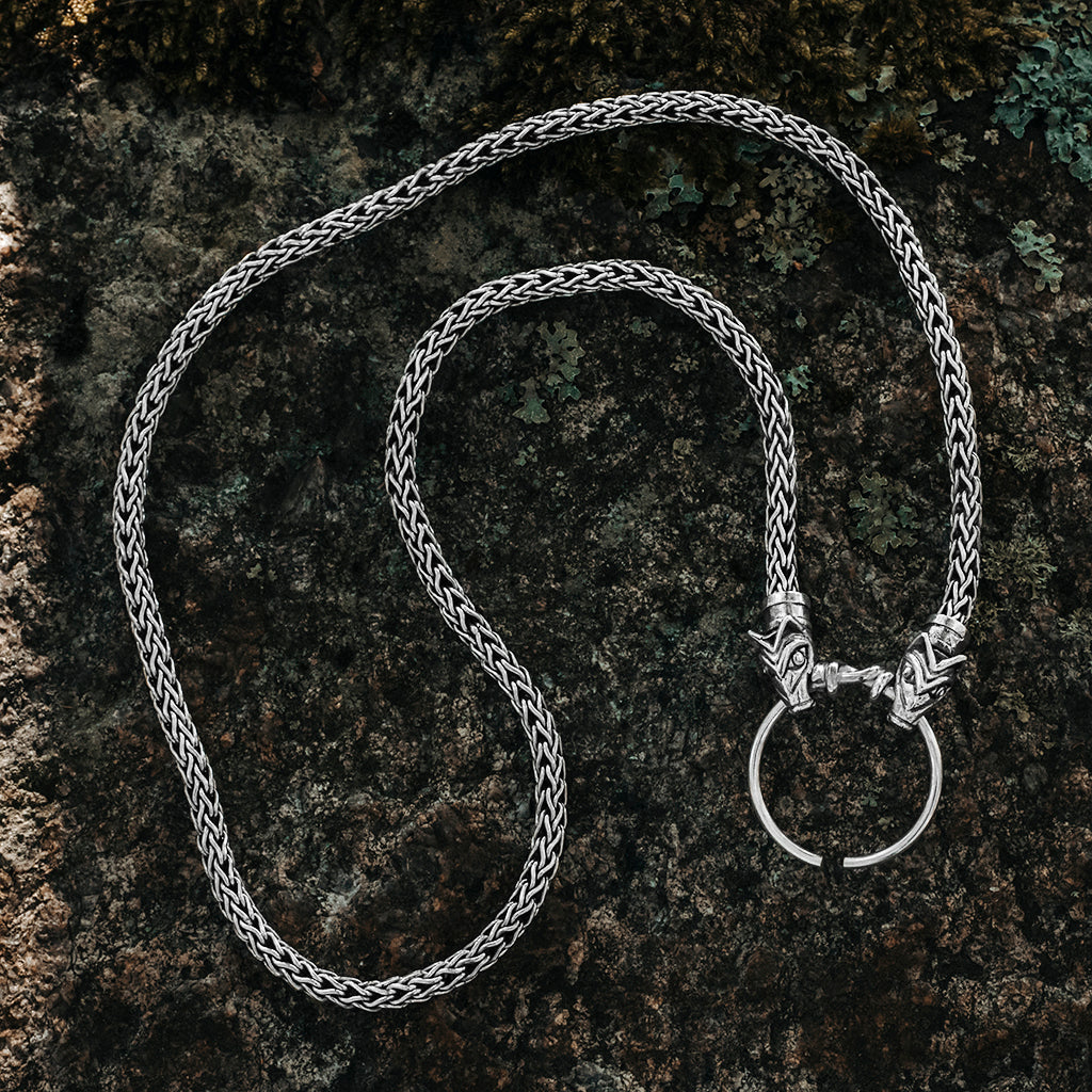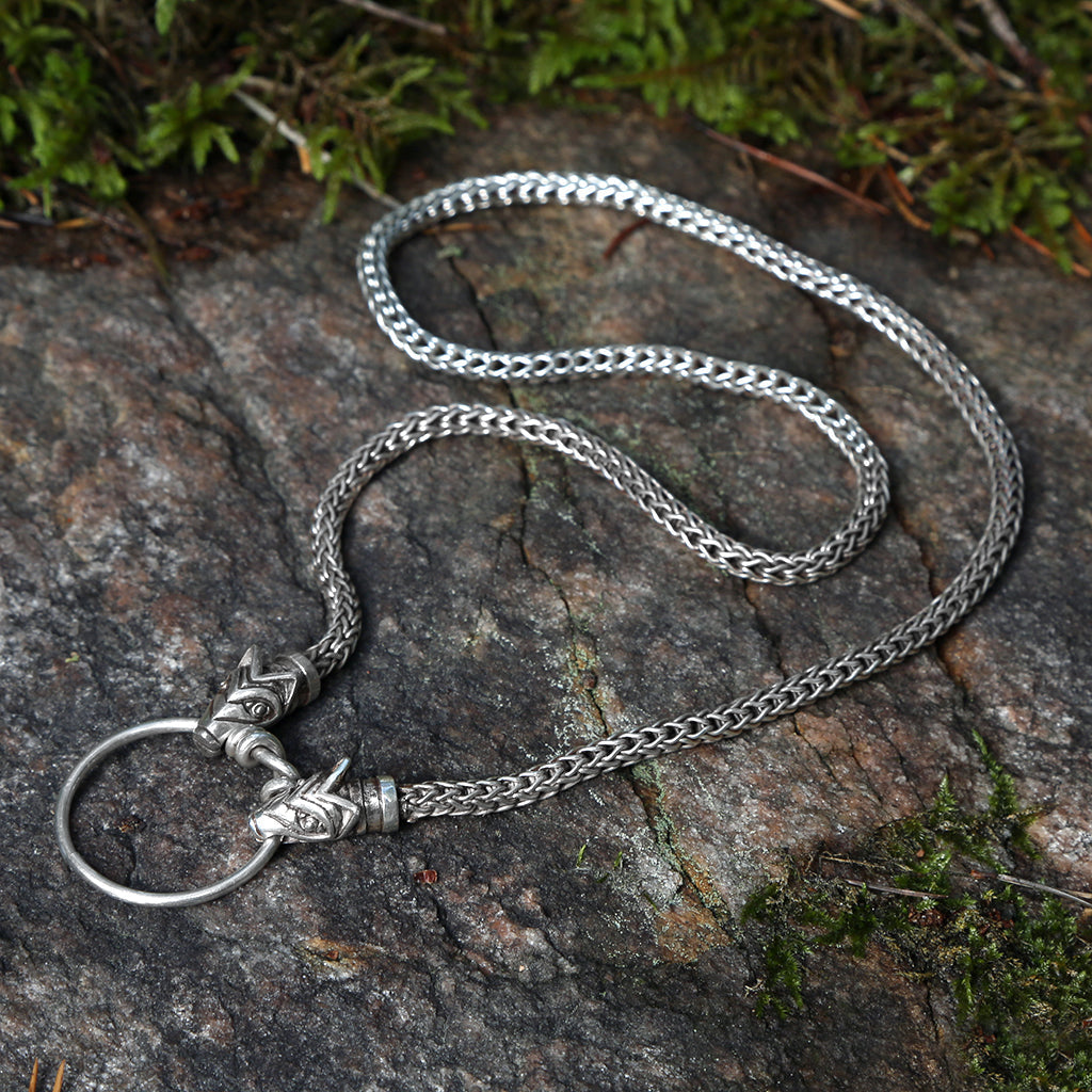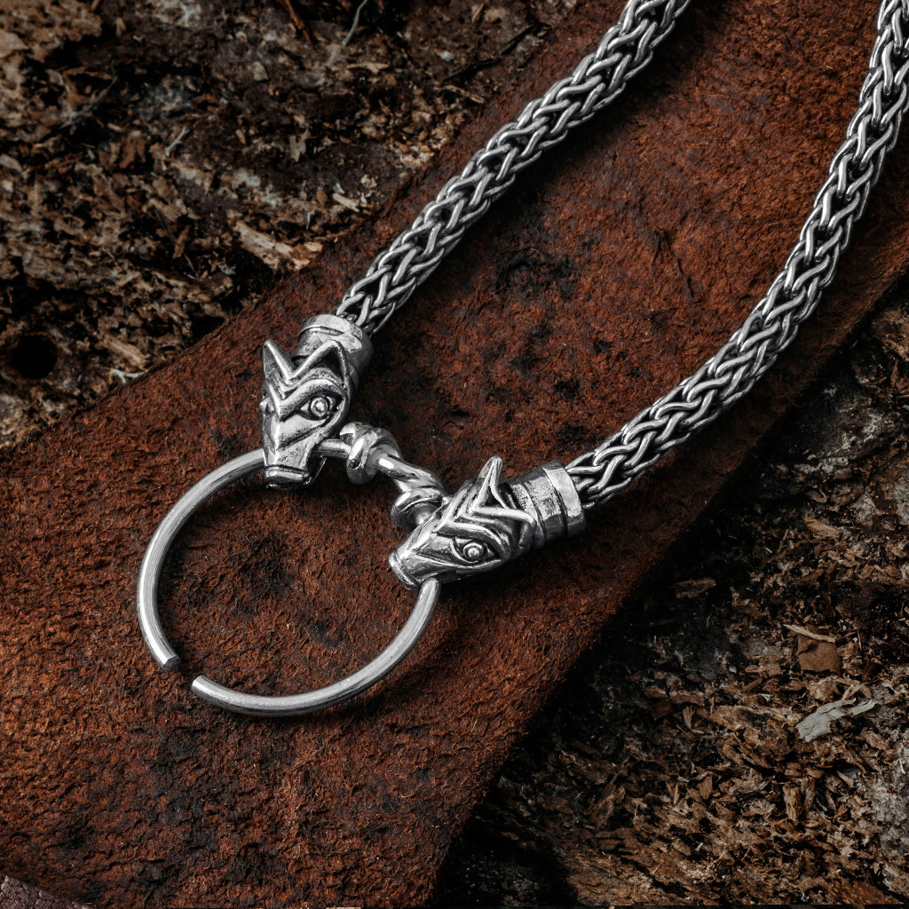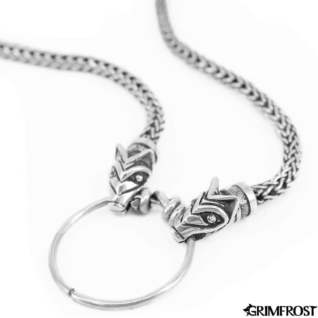 Die Wikinger verwendeten Halsketten mit Tieren oder Bestien, die auf einen Ring bissen, an dem Anhänger hingen. Diese Variante aus geflochtenem Sterlingsilber ist ein wahrhaft majestätisches Stück, das in den Köpfen von Freki und Geri endet, die sich an einem Anhängerring festbeißen.