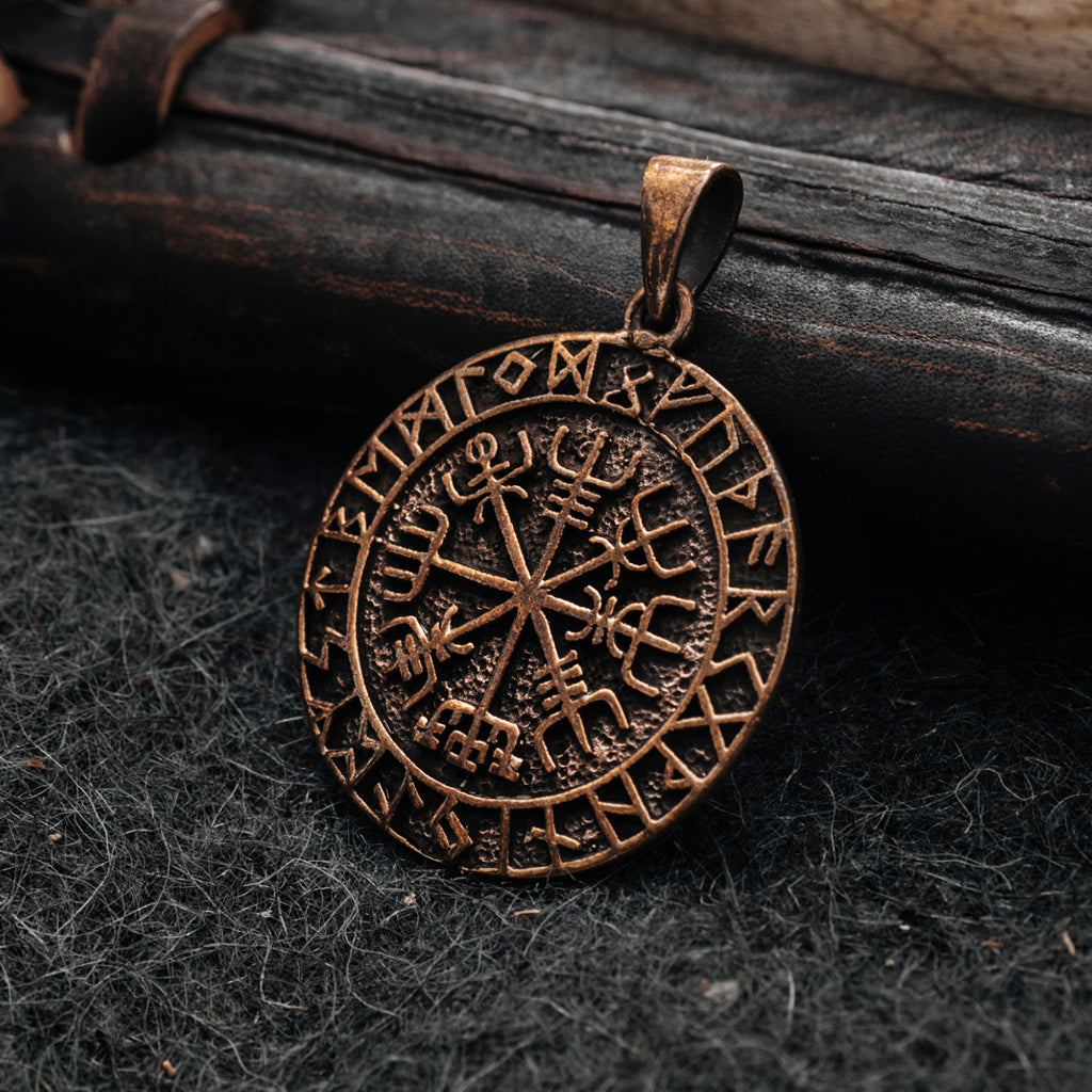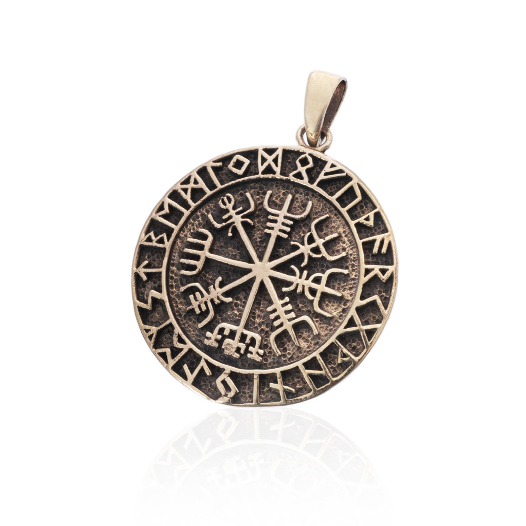 Dieses Bronzeamulett hat das Vegvísir-Symbol in der Mitte, umgeben vom gesamten Runenalphabet des Älteren Futhark.