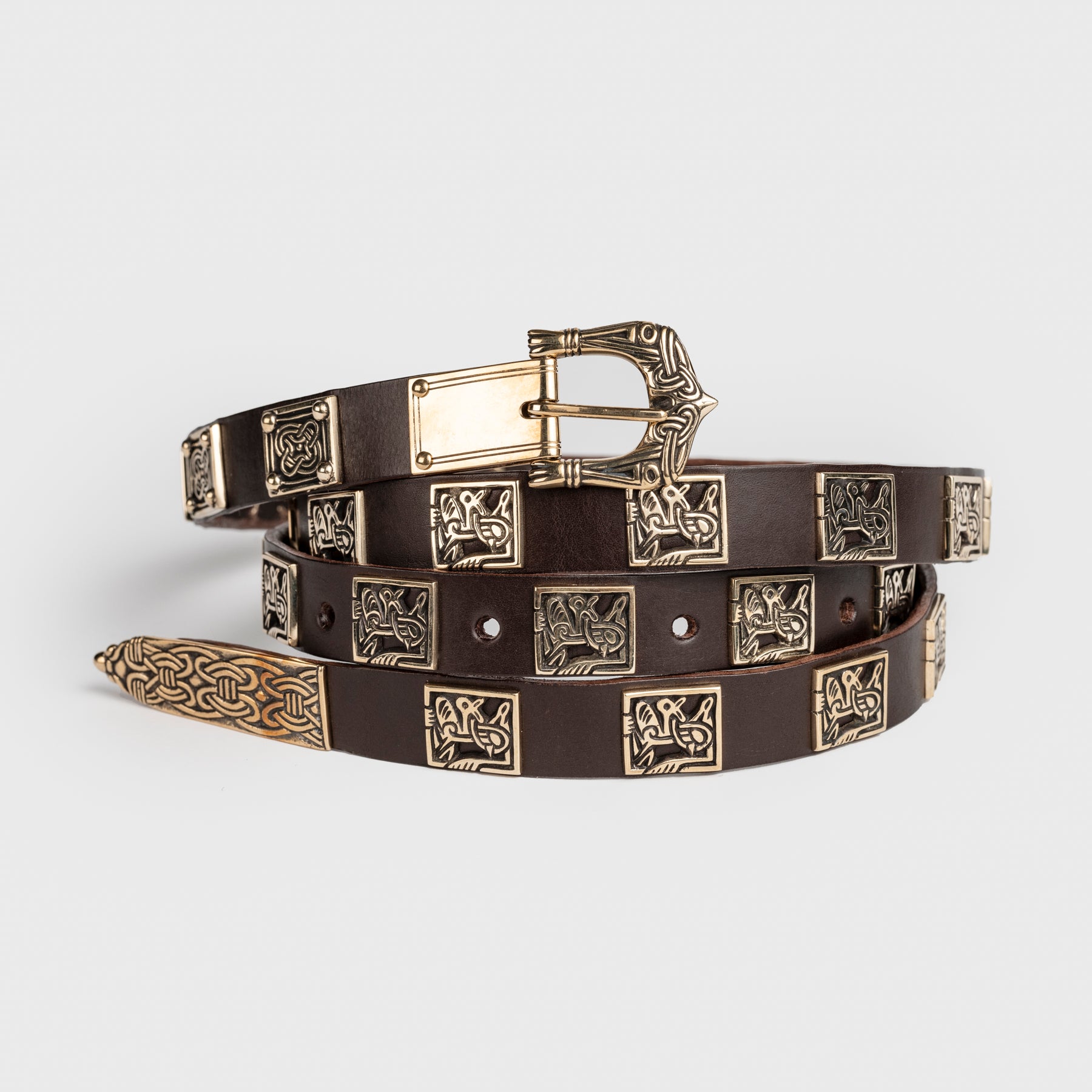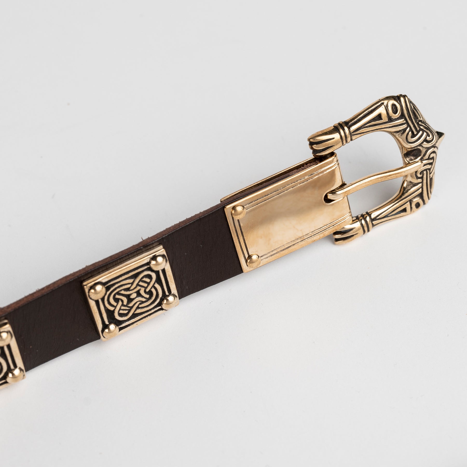 Dieser hochwertige Wikingergürtel ist mit Bronze überzogen und basiert auf einem Fund aus dem Grab Bj 369 in Birka, Schweden. Als wirklich herausragendes Stück ist dieser Gürtel für wahre Kenner der Wikingerzeit, die historische Authentizität und die Arbeit schätzen, die in der Herstellung eines hochwertigen Stücks wie diesem steckt.