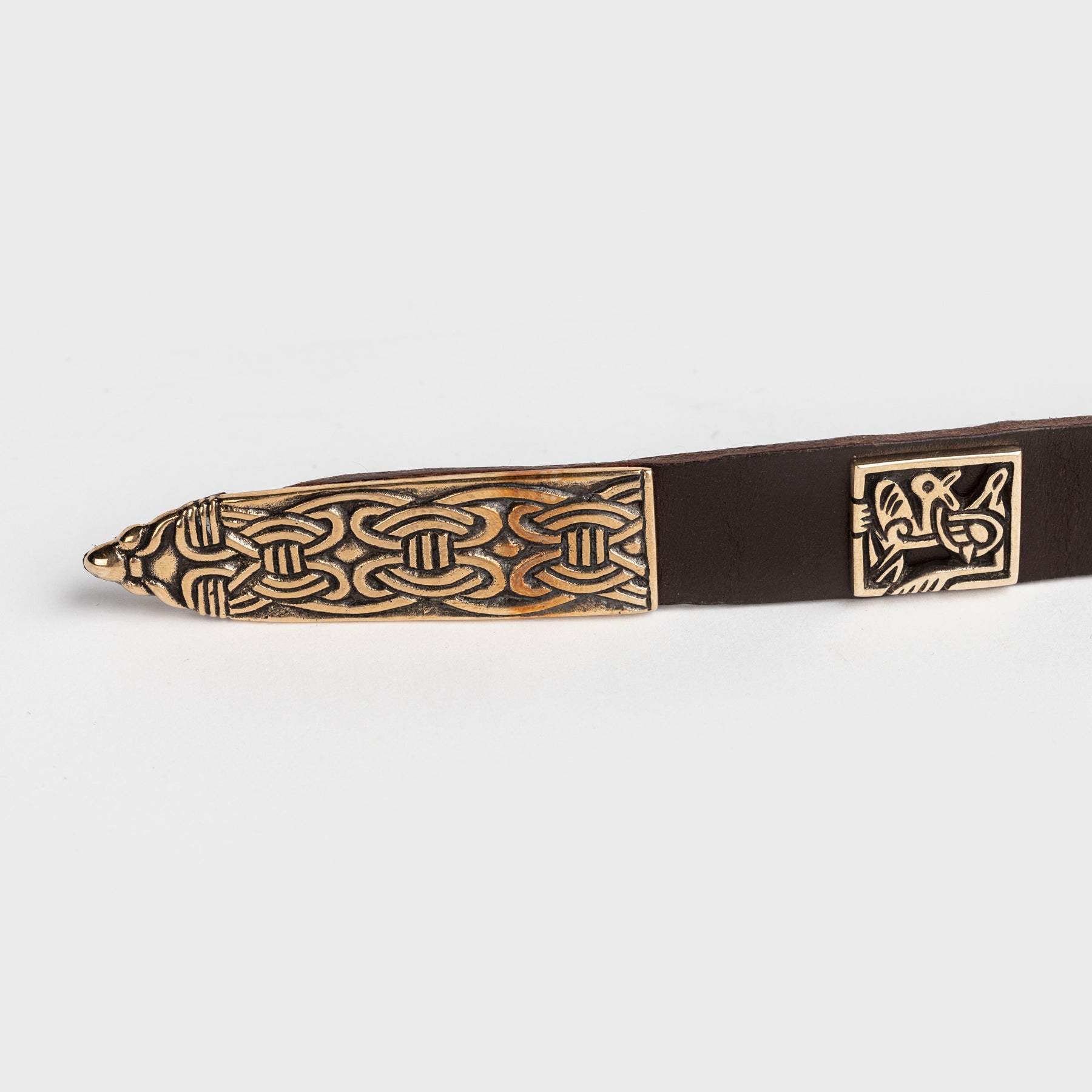 Der Gürtel ist mit Bronzebeschlägen versehen, die zur Schnalle und zum Riemenende passen. Ein reich verzierter Gürtel wie dieser gehörte einer hochrangigen Person, etwa einem Häuptling oder einem wohlhabenden Wikinger.
