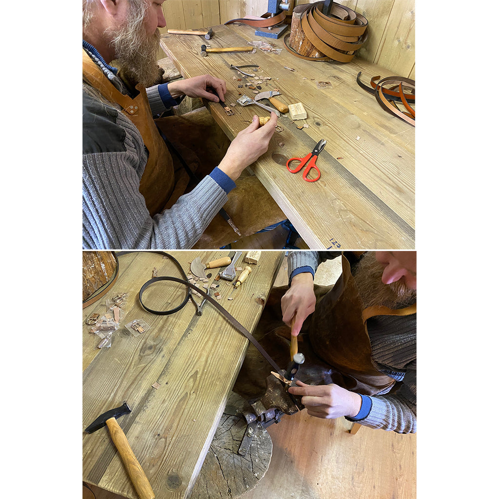 Der Gürtel ist aus strapazierfähigem Ochsenleder handgefertigt und mit historisch korrekten Bronzebeschlägen und einem Riemenende versehen. Der dicke Gürtel ist stabil genug, um auch schwerere Gegenstände daran zu befestigen.