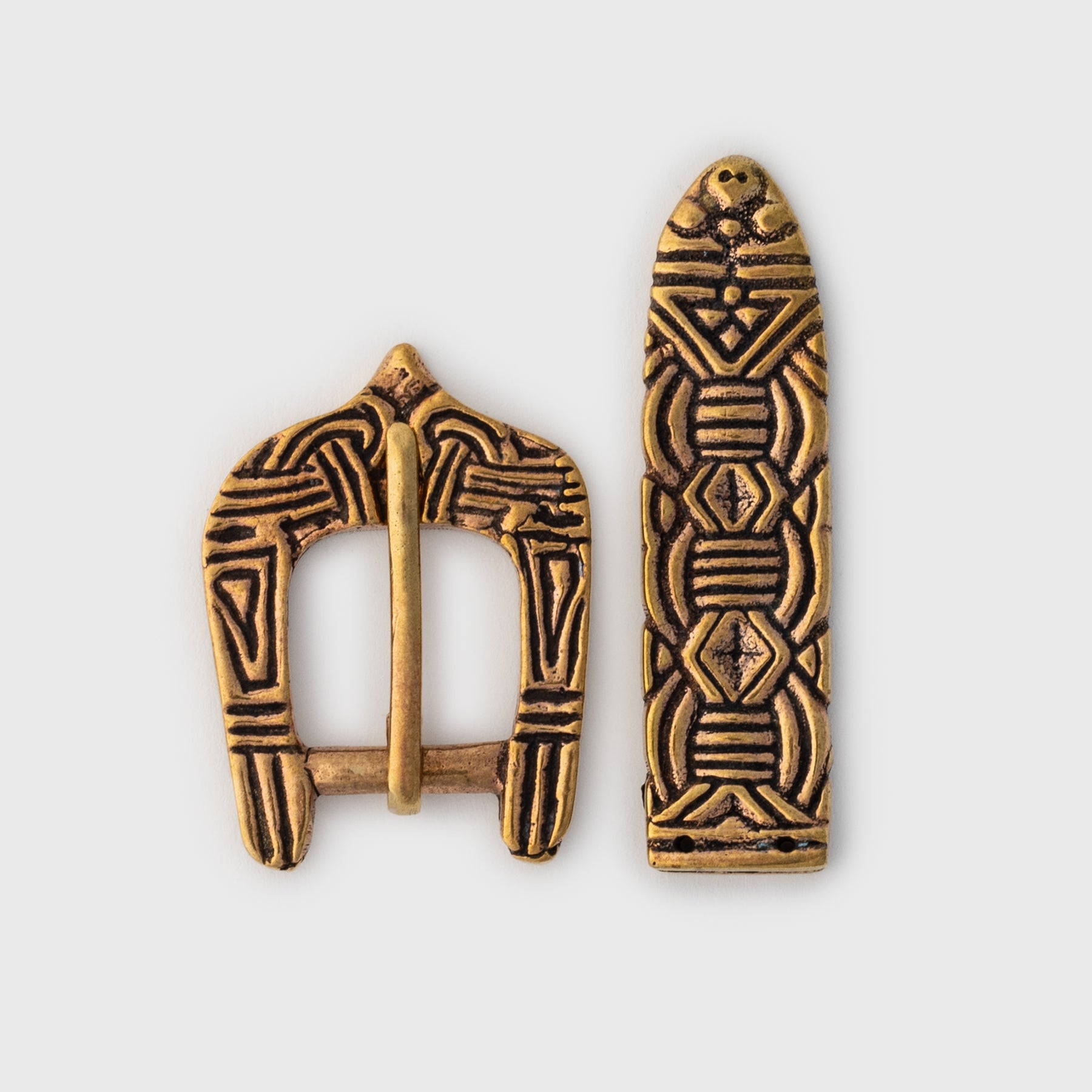 Ein Set mit einer bronzenen Gürtelschnalle und einem Riemenende im typischen Stil der Wikingerzeit. Sie passen zu einem Gürtel, der 12 mm breit ist. Die Schnalle und das Riemenende werden mit Nieten befestigt oder durch die vorgebohrten Löcher genäht. Nieten sind nicht im Lieferumfang enthalten.