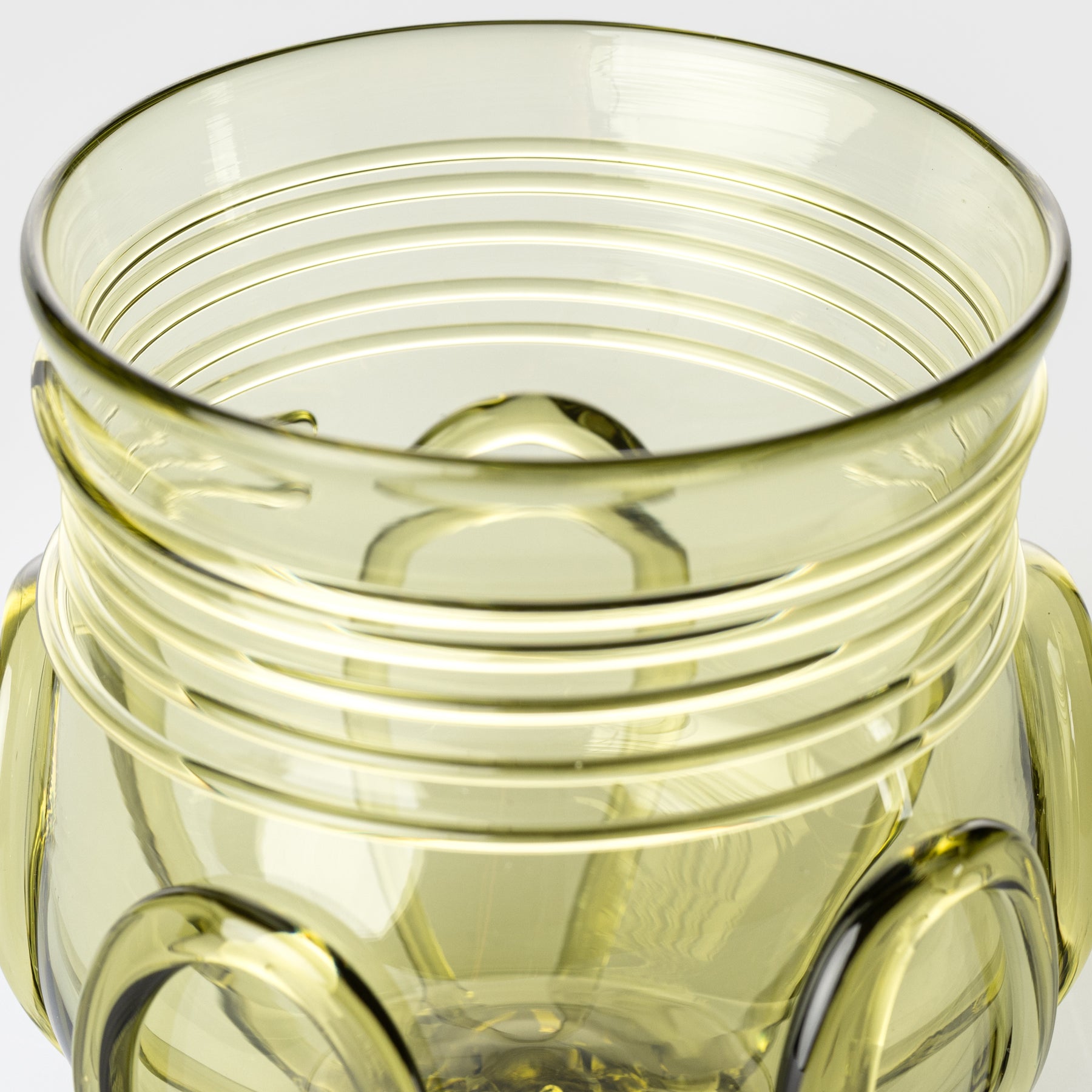 Eine sorgfältig handgefertigte Reproduktion eines wikingerzeitlichen Bechers aus blau-grünlichem Glas.